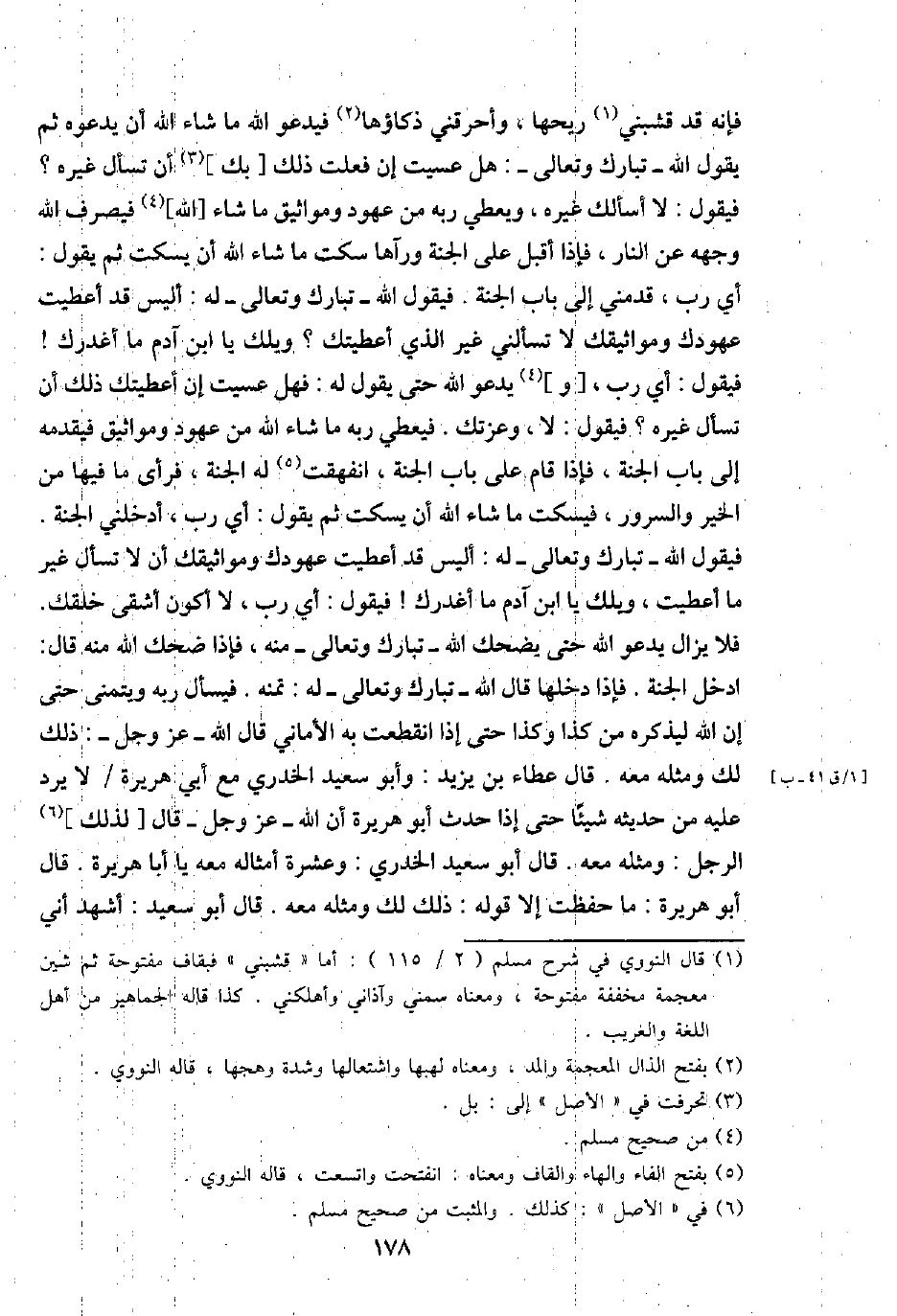 فَإِنَّهُ قد قشبني رِيحهَا، وأحرقني ذكاؤها فيدعو الله مَا شَاءَ الله أَن يَدعُوهُ ثمَّ يَقُول الله - تبَارك وَتَعَالَى -: هَل عَسَيْت إِن فعلت ذَلِك [بك] أَن تسْأَل غَيره؟ فَيَقُول: لَا أَسأَلك غَيره، وَيُعْطِي ربه من عهود ومواثيق مَا شَاءَ [الله] فَيصْرف الله وَجهه عَن النَّار، فَإِذا أقبل على الْجنَّة وَرَآهَا سكت مَا شَاءَ الله أَن يسكت ثمَّ يَقُول: أَي رب، قدمني إِلَى بَاب الْجنَّة. فَيَقُول الله - تبَارك وَتَعَالَى - لَهُ: أَلَيْسَ قد أَعْطَيْت عهودك ومواثيقك لَا تَسْأَلنِي غير الَّذِي أَعطيتك؟ وَيلك يَا ابْن آدم مَا أغدرك! فَيَقُول: أَي رب، [و] يَدْعُو الله حَتَّى يَقُول لَهُ: فَهَل عَسَيْت إِن إعطيتك ذَلِك أَن تسْأَل غَيره؟ فَيَقُول: لَا، وَعزَّتك. فيعطي ربه مَا شَاءَ الله من عهود ومواثيق فَيقدمهُ إِلَى بَاب الْجنَّة، فَإِذا قَامَ على بَاب الْجنَّة، انفهقت لَهُ الْجنَّة، فَرَأى مَا فِيهَا من الْخَيْر وَالسُّرُور، فيسكت مَا شَاءَ الله أَن يسكت ثمَّ يَقُول: أَي رب، أدخلني الْجنَّة. فَيَقُول الله - تبَارك وَتَعَالَى - لَهُ: أَلَيْسَ قد أَعْطَيْت عهودك ومواثيقك أَن لَا تسْأَل غير مَا أَعْطَيْت، وَيلك يَا ابْن آدم مَا أغدرك! فَيَقُول: أَي رب، لَا أكون أَشْقَى خلقك. فَلَا يزَال يَدْعُو الله حَتَّى يضْحك الله - تبَارك وَتَعَالَى - مِنْهُ، فَإِذا ضحك الله مِنْهُ قَالَ: ادخل الْجنَّة فَإِذا دَخلهَا قَالَ الله - تبَارك وَتَعَالَى - لَهُ: تمنه. فَيسْأَل ربه ويتمنى حَتَّى إِن الله ليذكره من كَذَا وَكَذَا حَتَّى إِذا انْقَطَعت بِهِ الْأَمَانِي قَالَ الله - عز وَجل -: ذَلِك لَك وَمثله مَعَه. قَالَ عَطاء بن يزِيد: وَأَبُو سعيد الْخُدْرِيّ مَعَ أبي هُرَيْرَة / لَا يرد عَلَيْهِ من حَدِيثه شَيْئا حَتَّى إِذا حدث أَبُو هُرَيْرَة أَن الله - عز وَجل - قَالَ [لذَلِك] الرجل: وَمثله مَعَه. قَالَ أَبُو سعيد الْخُدْرِيّ: وَعشرَة أَمْثَاله مَعَه أَبَا هُرَيْرَة. قَالَ أَبُو هُرَيْرَة: مَا حفظت إِلَّا قَوْله: ذَلِك لَك وَمثله مَعَه. قَالَ أَبُو سعيد: أشهد أَنِّي