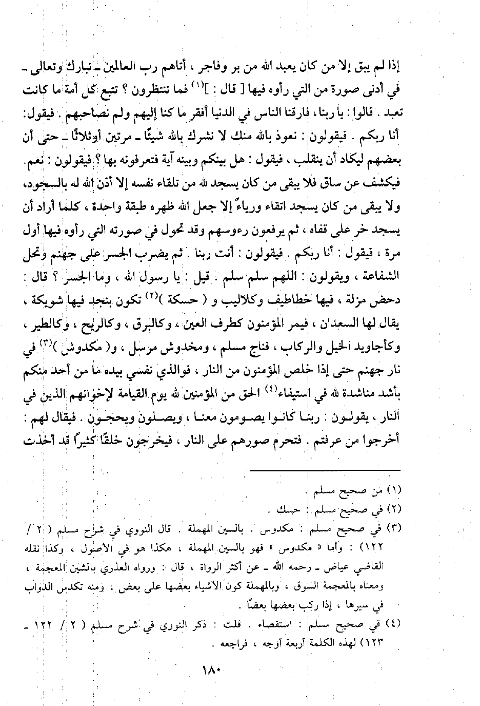 إِذا لم يبْق إِلَّا من كَانَ يعبد الله من بر وَفَاجِر، أَتَاهُم رب الْعَالمين - تبَارك وَتَعَالَى - فِي أدنى صُورَة من الَّتِي رَأَوْهُ فِيهَا [قَالَ:] فَمَا تنتظرون؟ تتبع كل أمة مَا كَانَت تعبد. قَالُوا: يَا رَبنَا، فارقنا النَّاس فِي الدُّنْيَا أفقر مَا كُنَّا إِلَيْهِم وَلم نصاحبهم: فَيَقُول: أَنا ربكُم. فَيَقُولُونَ: نعود بِاللَّه مِنْك لَا نشْرك بِاللَّه شَيْئا - مرَّتَيْنِ أَو ثَلَاثًا - حَتَّى أَن بَعضهم ليكاد أَن يَنْقَلِب، فَيَقُول: هَل بَيْنكُم وَبَينه آيَة فتعرفونه بهَا؟ فَيَقُولُونَ: نعم. فَيكْشف عَن سَاق فَلَا يبْقى من كَانَ يسْجد لله من تِلْقَاء نَفسه إِلَّا أذن الله لَهُ بِالسُّجُود، وَلَا يبْقى من كَانَ يسْجد اتقاء ورياء إِلَّا جعل الله ظَهره طبقَة وَاحِدَة، كلما أَرَادَ أَن يسْجد خر على قَفاهُ، ثمَّ يرفعون رُءُوسهم وَقد تحول فِي صورته الَّتِي رَأَوْهُ فِيهَا أول مرّة، فَيَقُول: أَنا ربكُم. فَيَقُولُونَ: أَنْت رَبنَا. ثمَّ يضْرب الجسر على جَهَنَّم وَتحل الشَّفَاعَة، وَيَقُولُونَ: اللَّهُمَّ سلم سلم. قيل: يَا رَسُول الله، وَمَا الجسر؟ قَالَ: دحض مزلة، فِيهَا خطاطيف وكلاليب و (حسكة) تكون بِنَجْد فِيهَا شويكة، يُقَال لَهَا السعدان، فيمر الْمُؤْمِنُونَ كطرف الْعين، وكالبرق، وكالريح، وكالطير، وكأجاويد الْخَيل والركاب، فناج مُسلم، ومخدوش مُرْسل، و (مكدوش) فِي نَار جَهَنَّم حَتَّى إِذا خلص الْمُؤْمِنُونَ من النَّار، فوالذي نَفسِي بِيَدِهِ مَا من أحد مِنْكُم بأشد مناشدة لله فِي اسْتِيفَاء الْحق من الْمُؤمنِينَ لله يَوْم الْقِيَامَة لإخوانهم الَّذين فِي النَّار، يَقُولُونَ: رَبنَا كَانُوا يَصُومُونَ مَعنا، وَيصلونَ ويحجون. فَيُقَال لَهُم: أخرجُوا من عَرَفْتُمْ. فَتحرم صورهم على النَّار، فَيخْرجُونَ خلقا كثيرا قد أخذت