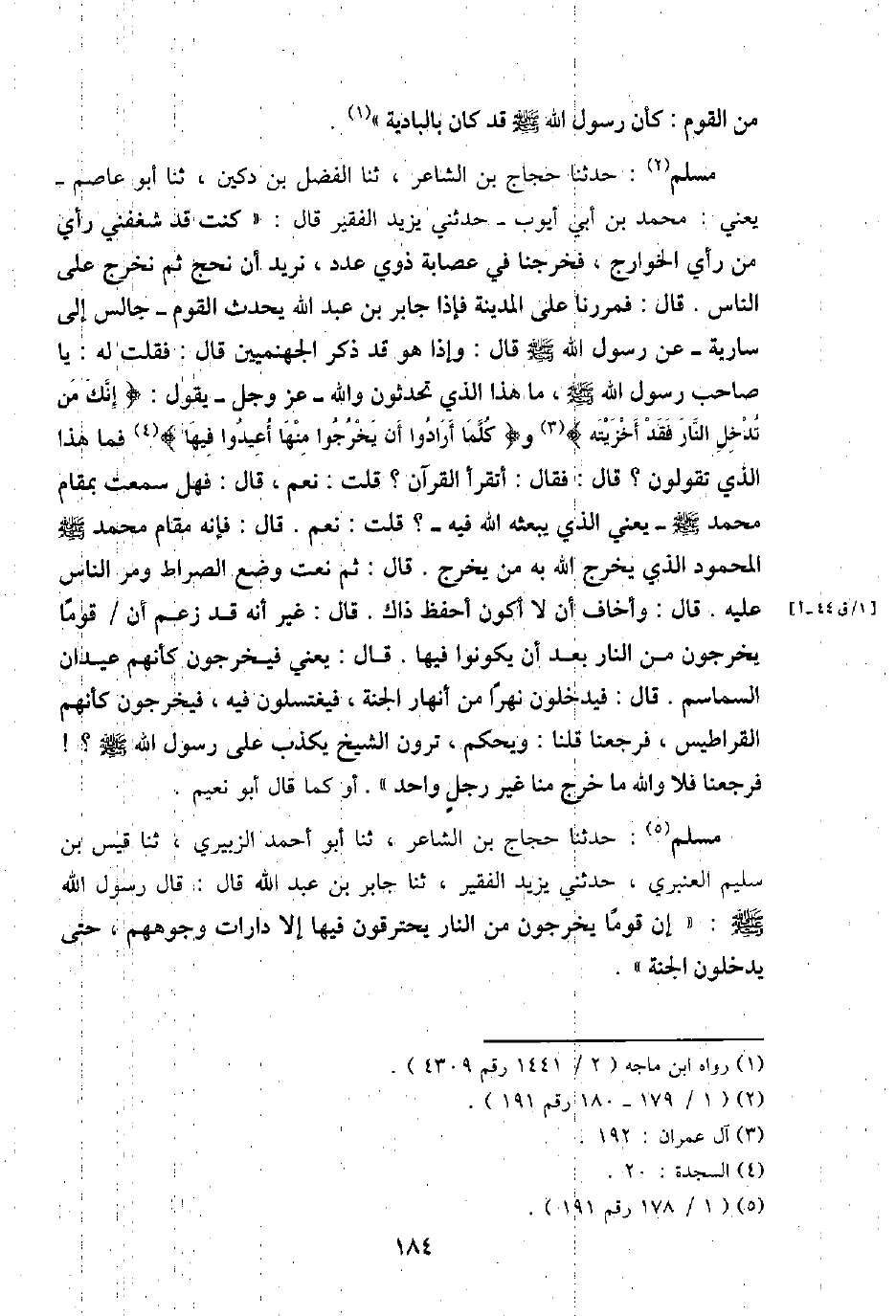 مُسلم: حَدثنَا حجاج بن الشَّاعِر، ثَنَا أَبُو أَحْمد الزبيرِي، ثَنَا قيس بن سليم الْعَنْبَري، حَدثنِي يزِيد الْفَقِير، ثَنَا جَابر بن عبد الله قَالَ: قَالَ رَسُول الله - صَلَّى اللَّهُ عَلَيْهِ وَسَلَّم َ -: " إِن قوما يخرجُون من النَّار يحترقون فِيهَا إِلَّا دارات وُجُوههم، حَتَّى يدْخلُونَ الْجنَّة ".