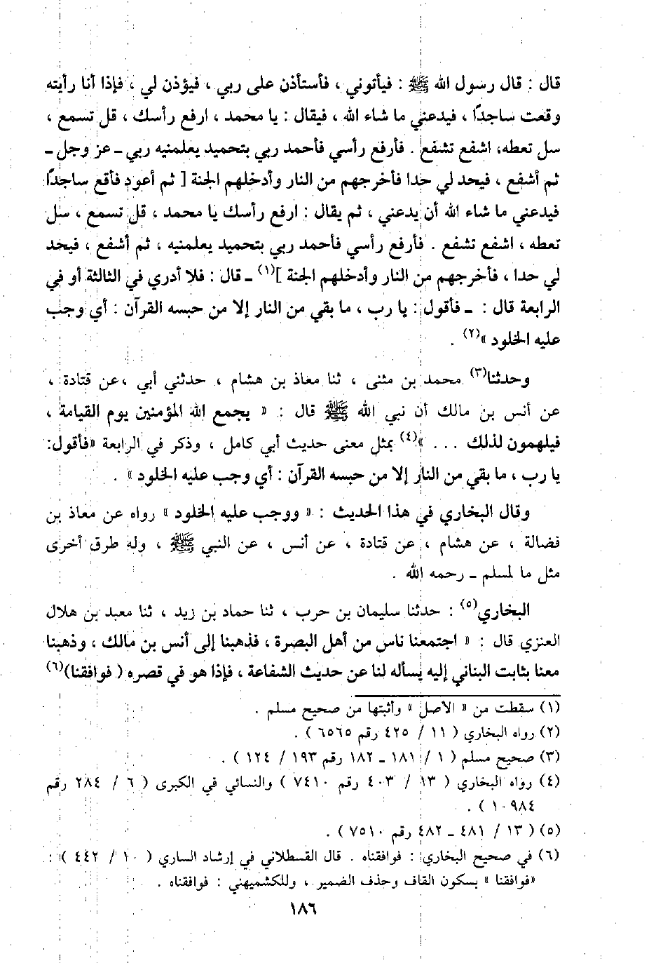 قَالَ: قَالَ رَسُول الله - صَلَّى اللَّهُ عَلَيْهِ وَسَلَّم َ -: فَيَأْتُوني، فأستاذن على رَبِّي، فَيُؤذن لي، فَإِذا أَنا رَأَيْته وَقعت سَاجِدا، فيدعني مَا شَاءَ الله، فَيُقَال: يَا مُحَمَّد، ارْفَعْ رَأسك، قل تسمع، سل تعطه، اشفع تشفع. فأرفع رَأْسِي فَأَحْمَد رَبِّي - بتحميد يعلمينه رَبِّي عز وَجل - ثمَّ اشفع، فَيحد لي حدا فَأخْرجهُمْ من النَّار وأدخلهم الْجنَّة [ثمَّ أَعُود فأقع سَاجِدا فيدعني مَا شَاءَ الله أَن يدعني، ثمَّ يُقَال: ارْفَعْ رَأسك يَا مُحَمَّد، قل تسمع، سل تعطه، اشفع تشفع. فأرفع رَأْسِي فَأَحْمَد رَبِّي بتحميد يعلمنيه، ثمَّ أشفع، فَيحد لي حدا، فَأخْرجهُمْ من النَّار وأدخلهم الْجنَّة]- قَالَ: فَلَا أَدْرِي فِي الثَّالِثَة أَو فِي الرَّابِعَة قَالَ: - فَأَقُول: يَا رب، مَا بَقِي من النَّار إِلَّا من حَبسه الْقُرْآن: أَي وَجب عَلَيْهِ الخلود ".