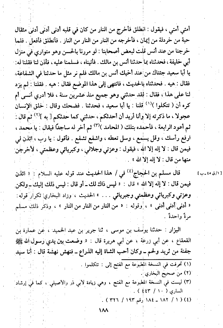 قَالَ مُسلم بن الْحجَّاج فِي / هَذَا الحَدِيث عِنْد قَوْله عَلَيْهِ السَّلَام: " ائْذَنْ فِيمَن قَالَ: لَا إِلَه إِلَّا الله " قَالَ: " لَيْسَ ذَاك لَك - أَو قَالَ: لَيْسَ ذَلِك إِلَيْك - وَلَكِن وَعِزَّتِي وكبريائي وعظمتي وجبريائي ... " الحَدِيث، وَزَاد البُخَارِيّ تكْرَار قَوْله: " أدنى أدنى أدنى "، وَقَوله " من النَّار من النَّار من النَّار "، وَذكر ذَلِك مُسلم مرّة وَاحِدَة.