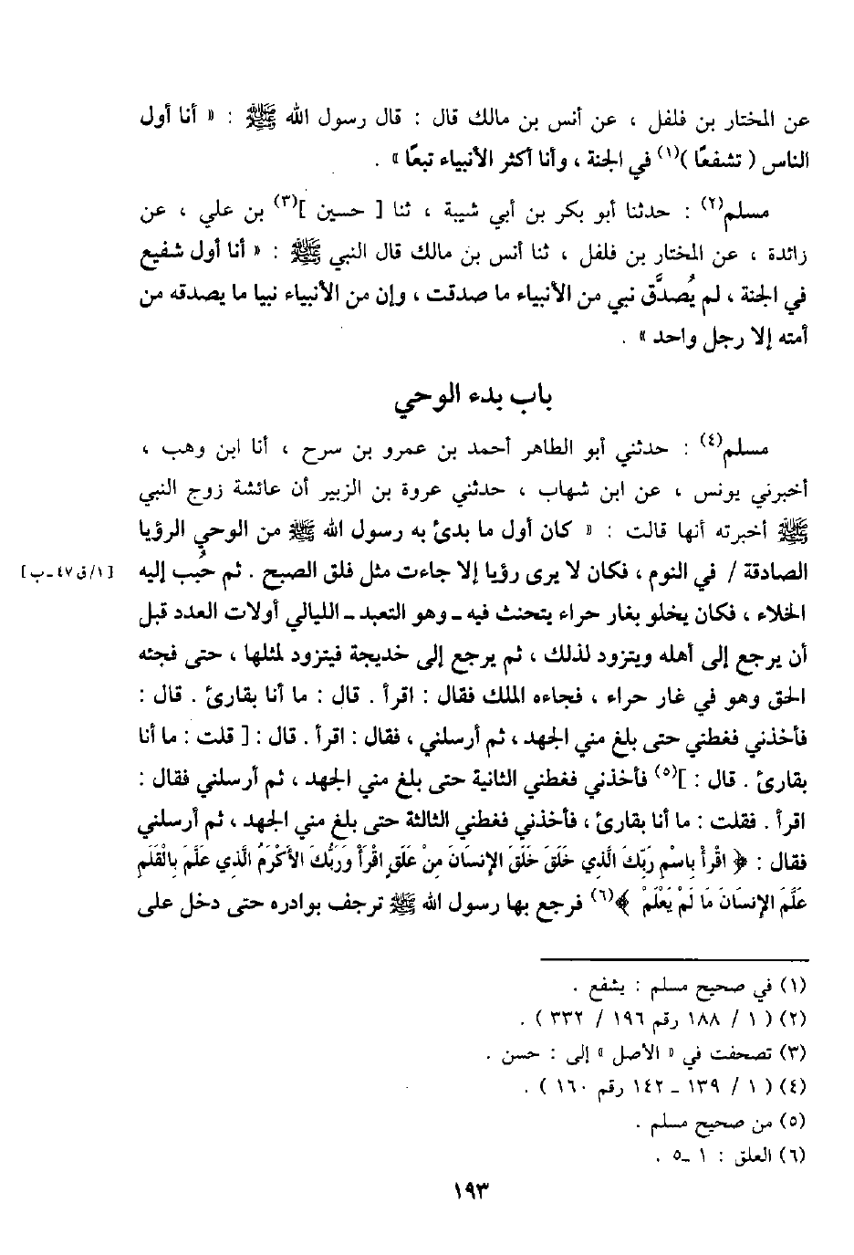 مُسلم: حَدثنِي أَبُو الطَّاهِر أَحْمد بن عَمْرو بن سرح، أَنا ابْن وهب، أَخْبرنِي يُونُس، عَن ابْن شهَاب، حَدثنِي عُرْوَة بن الزبير أَن عَائِشَة زوج النَّبِي - صَلَّى اللَّهُ عَلَيْهِ وَسَلَّم َ - أخْبرته أَنَّهَا قَالَت: " كَانَ أول مَا بُدِئَ بِهِ رَسُول الله - صَلَّى اللَّهُ عَلَيْهِ وَسَلَّم َ - من الْوَحْي الرُّؤْيَا الصادقة / فِي النّوم، فَكَانَ لَا يرى رُؤْيا إِلَّا جَاءَت مثل فلق الصُّبْح. ثمَّ حبب إِلَيْهِ الْخَلَاء، فَكَانَ يَخْلُو بِغَار حراء يَتَحَنَّث - فِيهِ وَهُوَ التَّعَبُّد - اللَّيَالِي أولات الْعدَد قبل أَن يرجع إِلَى أَهله ويتزود لذَلِك، ثمَّ يرجع إِلَى خديجه فيتزود لمثلهَا، حَتَّى فجئه الْحق وَهُوَ فِي غَار حراء، فَجَاءَهُ الْملك فَقَالَ: أَقرَأ. قَالَ: مَا أَنا بقارئ. قَالَ: فأخذني فغطني حَتَّى بلغ مني الْجهد، ثمَّ أَرْسلنِي، فَقَالَ: اقْرَأ. قَالَ: [قلت: مَا أَنا بقارئ. قَالَ:] فأخذني فغطني الثَّانِيَة حَتَّى بلغ مني الْجهد، ثمَّ أَرْسلنِي فَقَالَ: اقْرَأ. فَقلت: مَا أَنا بقارئ، فأخذني فغطني الثَّالِثَة حَتَّى بلغ مني الْجهد، ثمَّ أَرْسلنِي فَقَالَ: {اقْرَأ باسم رَبك الَّذِي خلق خلق الْإِنْسَان من علق اقْرَأ وَرَبك الأكرم الَّذِي علم بالقلم علم الْإِنْسَان مَا لم يعلم} فَرجع بهَا رَسُول الله - صَلَّى اللَّهُ عَلَيْهِ وَسَلَّم َ - ترجف بوادره حَتَّى دخل على
