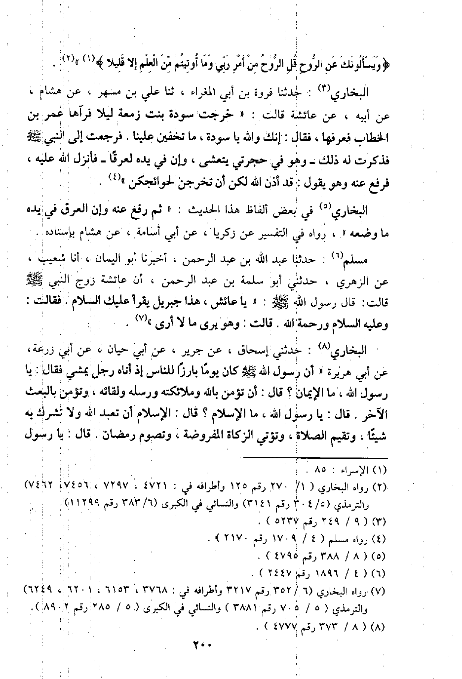 البُخَارِيّ: حَدثنِي إِسْحَاق، عَن جرير، عَن أبي حَيَّان، عَن أبي زرْعَة، عَن أبي هُرَيْرَة " أَن رَسُول الله - صَلَّى اللَّهُ عَلَيْهِ وَسَلَّم َ - كَانَ يَوْمًا بارزاً للنَّاس إِذْ أَتَاهُ رجل يمشي فَقَالَ: يَا رَسُول الله، مَا الْإِيمَان؟ قَالَ: أَن تؤمن بِاللَّه وَمَلَائِكَته وَرُسُله ولقائه، وتؤمن بِالْبَعْثِ الآخر. قَالَ: يَا رَسُول الله، مَا الْإِسْلَام؟ قَالَ: الْإِسْلَام أَن تعبد الله وَلَا تشرك بِهِ شَيْئا، وتقيم الصَّلَاة، وتؤتي الزَّكَاة الْمَفْرُوضَة، وتصوم رَمَضَان. قَالَ: يَا رَسُول