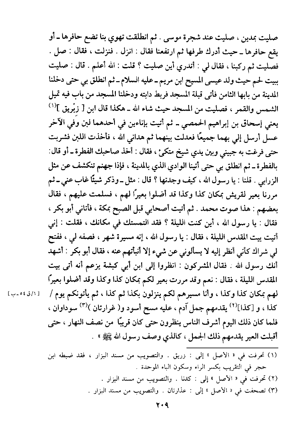 صليت بمدين، صليت عِنْد شَجَرَة مُوسَى. ثمَّ انْطَلَقت تهوي بِنَا تضع حافرها - أَو يَقع حافرها - حَيْثُ أدْرك طرفها ثمَّ ارتفعنا فَقَالَ: انْزِلْ. فَنزلت، فَقَالَ: صل. فَصليت ثمَّ ركبنَا، فَقَالَ لي: أَتَدْرِي أَيْن صليت؟ قلت: الله أعلم. قَالَ: صليت بَيت لحم حَيْثُ ولد عِيسَى الْمَسِيح ابْن مَرْيَم - عَلَيْهِ السَّلَام - ثمَّ انْطلق بِي حَتَّى دَخَلنَا الْمَدِينَة من بَابهَا الثَّامِن فَأتى قبْلَة الْمَسْجِد فَربط دَابَّته ودخلنا الْمَسْجِد من بَاب فِيهِ تميل الشَّمْس وَالْقَمَر، فَصليت من الْمَسْجِد حَيْثُ شَاءَ الله - هَكَذَا قَالَ ابْن [زبريق] يَعْنِي إِسْحَاق بن إِبْرَاهِيم الْحِمصِي - ثمَّ أتيت بإناءين فِي أَحدهمَا لبن وَفِي الآخر عسل أرسل إِلَيّ بهما جَمِيعًا فعدلت بَينهمَا ثمَّ هَدَانِي الله، فَأخذت اللَّبن فَشَرِبت حَتَّى فرغت بِهِ جبيني وَبَين يَدي شيخ متكئ، فَقَالَ: أَخذ صَاحبك الْفطْرَة - أَو قَالَ: بالفطرة - ثمَّ انْطلق بِي حَتَّى أَتَيْنَا الْوَادي الَّذِي بِالْمَدِينَةِ، فَإِذا جَهَنَّم تنكشف عَن مثل الزرابي. قُلْنَا: يَا رَسُول الله، كَيفَ وَجدتهَا؟ قَالَ: مثل - وَذكر شَيْئا غَابَ عني - ثمَّ مَرَرْنَا بعير لقريش بمَكَان كَذَا وَكَذَا قد أَضَلُّوا بَعِيرًا لَهُم، فَسلمت عَلَيْهِم، فَقَالَ بَعضهم: هَذَا صَوت مُحَمَّد. ثمَّ أتيت أَصْحَابِي قبل الصُّبْح بِمَكَّة، فَأَتَانِي أَبُو بكر، فَقَالَ: يَا رَسُول الله، أَيْن كنت اللَّيْلَة؟ فقد التمستك فِي مَكَانك، فَقلت: إِنِّي أتيت بَيت الْمُقَدّس اللَّيْلَة، فَقَالَ: يَا رَسُول الله، إِنَّه مسيرَة شهر، فصفه لي، فَفتح لي شِرَاك كَأَنِّي أنظر إِلَيْهِ لَا يَسْأَلُونِي عَن شَيْء إِلَّا أنبأتهم عَنهُ، فَقَالَ أَبُو بكر: أشهد أَنَّك رَسُول الله. فَقَالَ الْمُشْركُونَ: انْظُرُوا إِلَى ابْن أبي كَبْشَة يزْعم أَنه أَتَى بَيت الْمُقَدّس اللَّيْلَة، فَقَالَ: نعم وَقد مَرَرْت بعير لكم بمَكَان كَذَا وَكَذَا وَقد أَضَلُّوا بَعِيرًا لَهُم بمَكَان كَذَا وَكَذَا، وَأَنا مَسِيرهمْ لكم ينزلون بِكَذَا ثمَّ كَذَا، ثمَّ يأتونكم يَوْم / كَذَا، وَكَذَا يقدمهم جمل آدم، عَلَيْهِ مسح أسود و (غِرَارَتَانِ) سوداوان، فَلَمَّا كَانَ ذَلِك الْيَوْم أشرف النَّاس ينظرُونَ حَتَّى كَانَ قَرِيبا من نصف النَّهَار، حَتَّى أَقبلت العير يقدمهم ذَلِك الْجمل، كَالَّذي وصف رَسُول الله - صَلَّى اللَّهُ عَلَيْهِ وَسَلَّم َ - ".