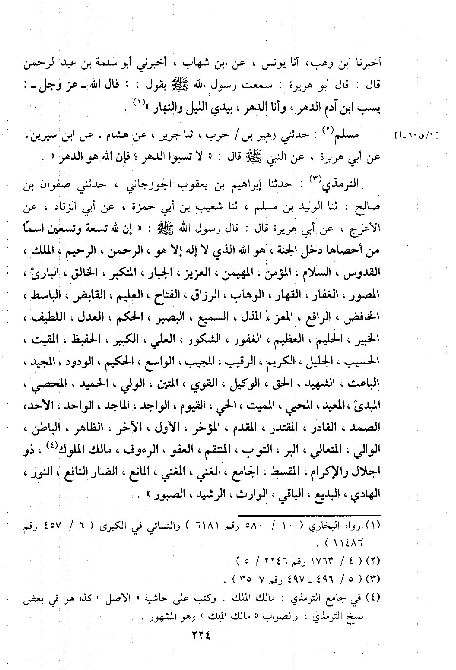 التِّرْمِذِيّ: حَدثنَا إِبْرَاهِيم بن يَعْقُوب الْجوزجَاني، حَدثنِي صَفْوَان بن صَالح، ثَنَا الْوَلِيد بن مُسلم، ثَنَا شُعَيْب بن أبي حَمْزَة، عَن أبي الزِّنَاد، عَن الْأَعْرَج، عَن أبي هُرَيْرَة قَالَ: قَالَ رَسُول الله - صَلَّى اللَّهُ عَلَيْهِ وَسَلَّم َ -: " إِن لله تِسْعَة وَتِسْعين اسْما من أحصاها دخل الْجنَّة، هُوَ الله الَّذِي لَا إِلَه إِلَّا هُوَ، الرَّحْمَن، الرَّحِيم، الْملك، القدوس، السَّلَام، الْمُؤمن، الْمُهَيْمِن، الْعَزِيز، الْجَبَّار، المتكبر، الْخَالِق، البارئ، المصور، الْغفار، القهار، الْوَهَّاب، الرَّزَّاق، الفتاح، الْعَلِيم، الْقَابِض، الباسط، الْخَافِض، الرافع، الْمعز، المذل، السَّمِيع، الْبَصِير، الحكم، الْعدْل، اللَّطِيف، الْخَبِير، الحيلم، الْعَظِيم، الغفور، الشكُور، الْعلي، الْكَبِير، الحفيظ، المقيت، الحسيب، الْجَلِيل، الْكَرِيم، الرَّقِيب، الْمُجيب، الْوَاسِع، الْحَكِيم، الْوَدُود، الْمجِيد، الْبَاعِث، الشَّهِيد، الْحق، الْوَكِيل، الْقوي، المتين، الْوَلِيّ، الحميد، المحصي، المبدئ، المعيد، المحيي، المميت، الْحَيّ، القيوم، الْوَاجِد، الْمَاجِد، الْوَاحِد، الْأَحَد، الصَّمد، الْقَادِر، المقتدر، الْمُقدم، الْمُؤخر، الأول، الآخر، الظَّاهِر، الْبَاطِن، الْوَالِي، المتعالي، الْبر، التواب، المنتقم، الْعَفو، الرءوف، مَالك الْمُلُوك، ذُو الْجلَال وَالْإِكْرَام، المقسط، الْجَامِع، الْغَنِيّ، الْمُغنِي، الْمَانِع، الضار النافع، النُّور، الْهَادِي، البديع، الْبَاقِي، الْوَارِث، الرشيد، الصبور ".