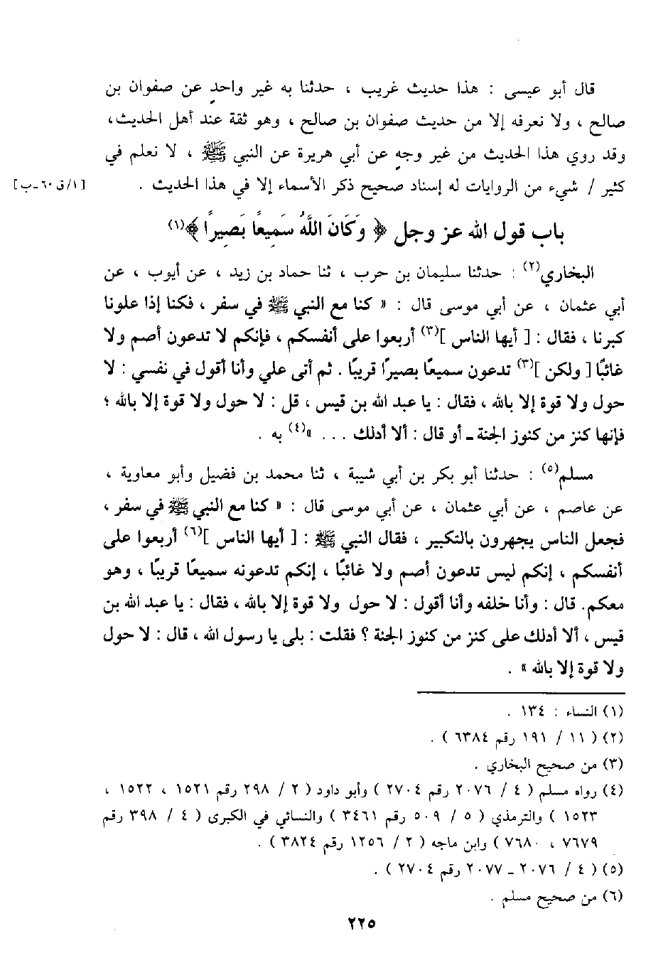 البُخَارِيّ: حَدثنَا سُلَيْمَان بن حَرْب، ثَنَا حَمَّاد بن زيد، عَن أَيُّوب، عَن أبي عُثْمَان، عَن أبي مُوسَى قَالَ: " كُنَّا مَعَ النَّبِي - صَلَّى اللَّهُ عَلَيْهِ وَسَلَّم َ - فِي سفر، فَكُنَّا إِذا علونا كبرنا، فَقَالَ: [أَيهَا النَّاس] أربعوا على أَنفسكُم، فَإِنَّكُم لَا تدعون أَصمّ وَلَا غَائِبا [وَلَكِن] تدعون سميعاً بَصيرًا قَرِيبا. ثمَّ أَتَى عَليّ وَأَنا أَقُول فِي نَفسِي: لَا حول وَلَا قُوَّة إِلَّا بِاللَّه، فَقَالَ: يَا عبد الله بن قيس، قل: لَا حول وَلَا قُوَّة إِلَّا بِاللَّه؛ فَإِنَّهَا كنز من كنوز الْجنَّة - أَو قَالَ: أَلا أدلك ... " بِهِ.
