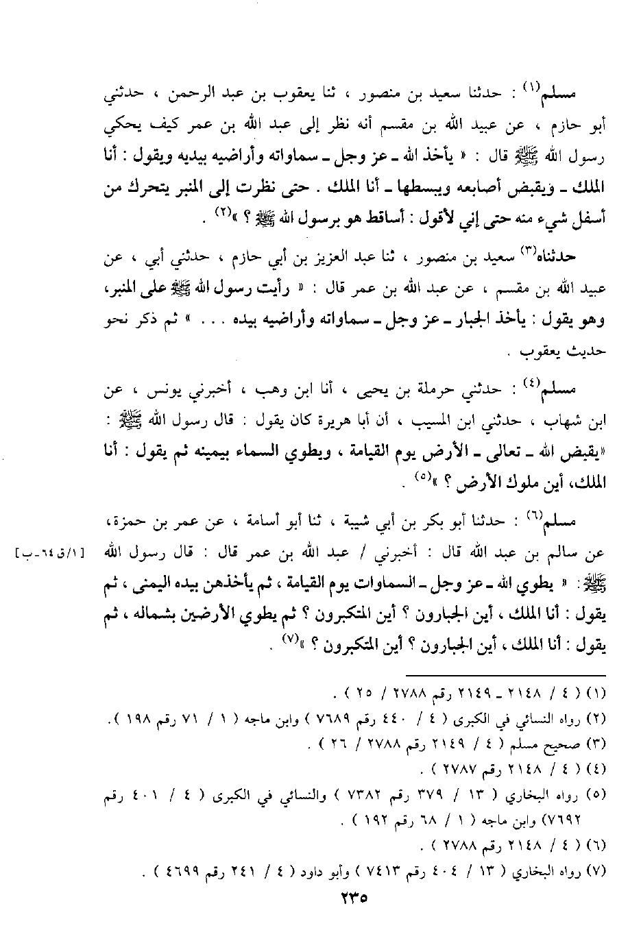 مُسلم: حَدثنَا أَبُو بكر بن أبي شيبَة، ثَنَا أَبُو أُسَامَة، عَن عمر بن حَمْزَة، عَن سَالم بن عبد الله قَالَ: أَخْبرنِي / عبد الله بن عمر قَالَ: قَالَ رَسُول الله - صَلَّى اللَّهُ عَلَيْهِ وَسَلَّم َ -: " يطوي الله - عز وَجل - السَّمَاوَات يَوْم الْقِيَامَة، ثمَّ يأخذهن بِيَدِهِ الْيُمْنَى، ثمَّ يَقُول: أَنا الْملك، أَيْن الجبارون؟ أَيْن المتكبرون؟ ثمَّ يطوي الْأَرْضين بِشمَالِهِ، ثمَّ يَقُول: أَنا الْملك، أَيْن الجبارون؟ أَيْن المتكبرون؟ ".
