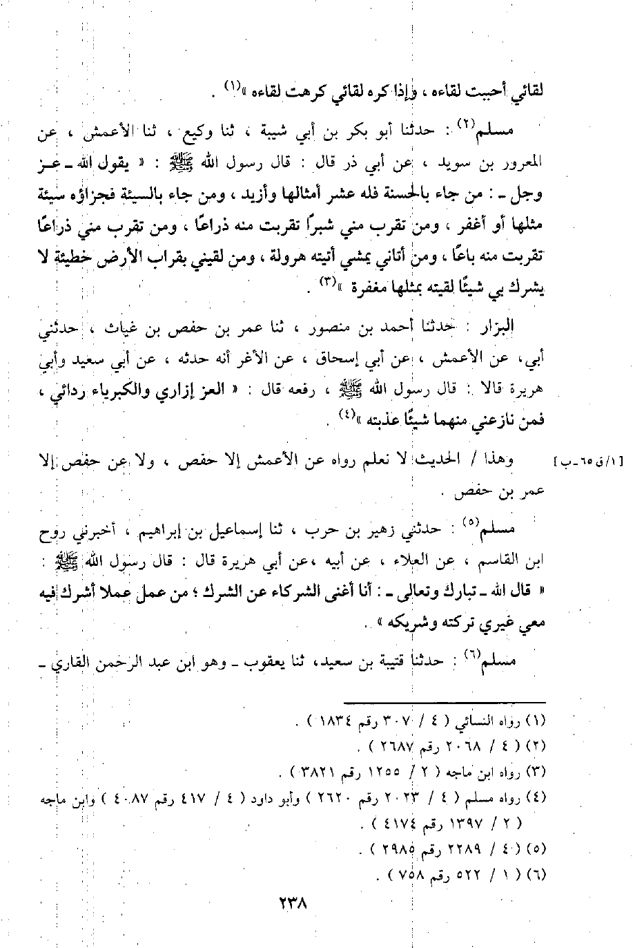 مُسلم: حَدثنَا أَبُو بكر بن أبي شيبَة، ثَنَا وَكِيع، ثَنَا الْأَعْمَش، عَن الْمَعْرُور بن سُوَيْد، عَن أبي ذَر قَالَ: قَالَ رَسُول الله - صَلَّى اللَّهُ عَلَيْهِ وَسَلَّم َ -: يَقُول الله - عز وَجل -: من جَاءَ بِالْحَسَنَة فَلهُ عشر أَمْثَالهَا وأزيد، وَمن جَاءَ بِالسَّيِّئَةِ فَجَزَاؤُهُ سَيِّئَة مثلهَا أَو أَغفر، وَمن تقرب مني شبْرًا تقربت مِنْهُ ذِرَاعا، وَمن تقرب مني ذِرَاعا تقربت مِنْهُ باعاً، وَمن أَتَانِي يمشي أَتَيْته هرولة، وَمن لَقِيَنِي بقراب الأَرْض خَطِيئَة لَا يُشْرك بِي شَيْئا لَقيته بِمِثْلِهَا مغْفرَة ".