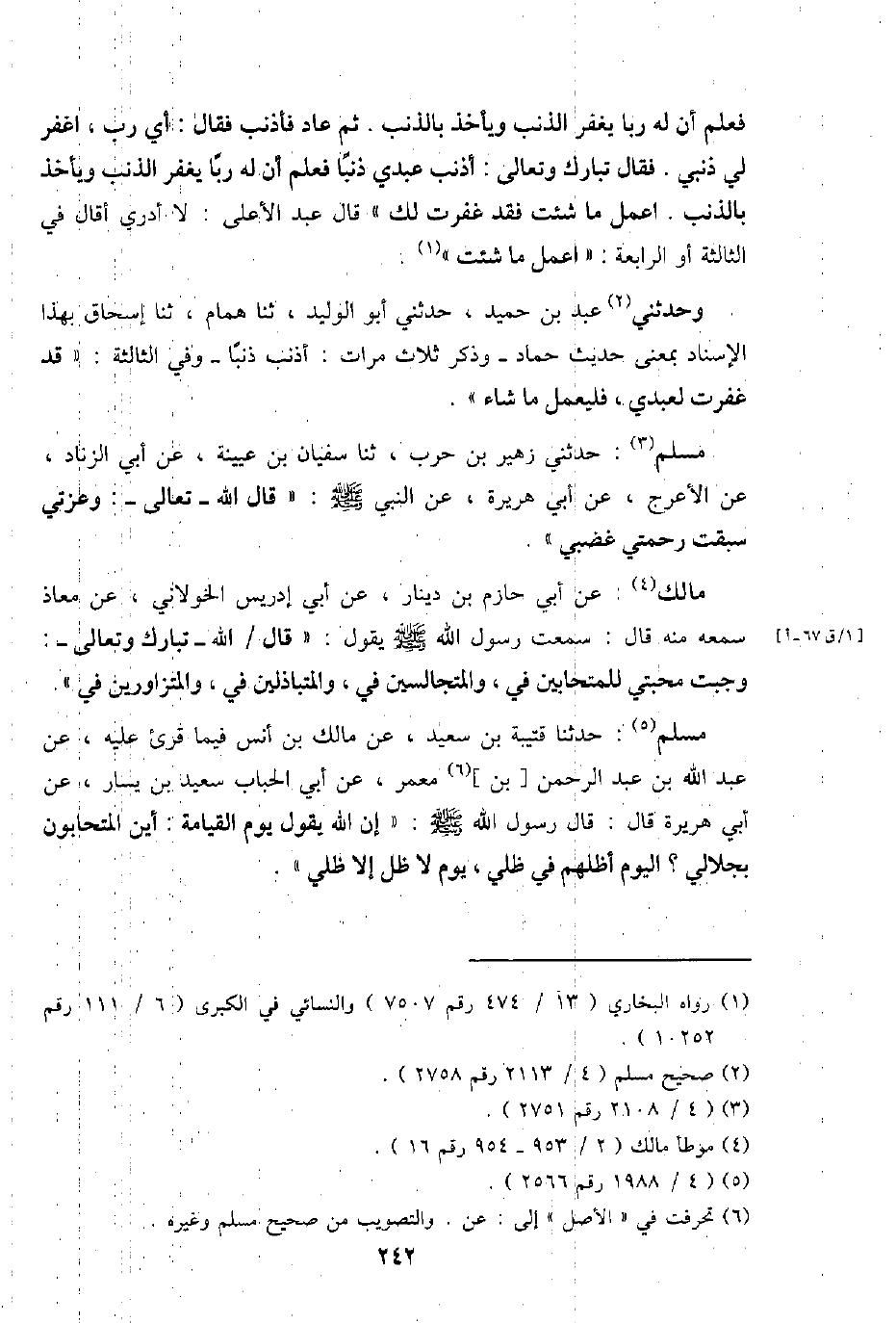 مُسلم: حَدثنِي زُهَيْر بن حَرْب، ثَنَا سُفْيَان بن عُيَيْنَة، عَن أبي الزِّنَاد، عَن الْأَعْرَج، عَن أبي هُرَيْرَة، عَن النَّبِي - صَلَّى اللَّهُ عَلَيْهِ وَسَلَّم َ -: " قَالَ الله - تَعَالَى -: وَعِزَّتِي سبقت رَحْمَتي غَضَبي ".