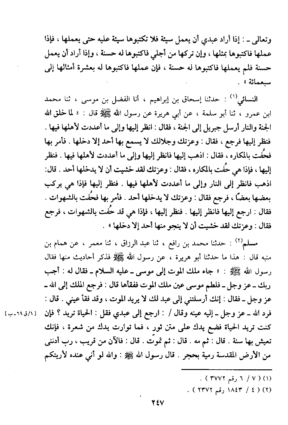النَّسَائِيّ: حَدثنَا إِسْحَاق بن إِبْرَاهِيم، أَنا الْفضل بن مُوسَى، ثَنَا مُحَمَّد ابْن عَمْرو، ثَنَا أَبُو سَلمَة، عَن أبي هُرَيْرَة عَن رَسُول الله - صَلَّى اللَّهُ عَلَيْهِ وَسَلَّم َ - قَالَ: " لما خلق الله الْجنَّة وَالنَّار أرسل جِبْرِيل إِلَى الْجنَّة، فَقَالَ: انْظُر إِلَيْهَا وَإِلَى مَا أَعدَدْت لأَهْلهَا فِيهَا. فَنظر إِلَيْهَا فَرجع، فَقَالَ: وَعزَّتك وجلالك لَا يسمع بهَا أحد إِلَّا دَخلهَا. فَأمر بهَا فحفت بالمكاره، فَقَالَ: اذْهَبْ إِلَيْهَا فَانْظُر إِلَيْهَا وَإِلَى مَا أَعدَدْت لأَهْلهَا فِيهَا. فَنظر إِلَيْهَا، فَإِذا هِيَ حفت بالمكاره، فَقَالَ: وَعزَّتك لقد خشيت أَن لَا يدخلهَا أحد. قَالَ: اذْهَبْ فَانْظُر إِلَى النَّار وَإِلَى مَا أَعدَدْت لأَهْلهَا فِيهَا. فَنظر إِلَيْهَا فَإِذا هِيَ يركب بَعْضهَا بَعْضًا، فَرجع فَقَالَ: وَعزَّتك لَا يدخلهَا أحد. فَأمر بهَا فحفت بالشهوات. فَقَالَ: ارْجع إِلَيْهَا فَانْظُر إِلَيْهَا. فَنظر إِلَيْهَا، فَإِذا هِيَ قد حفت بالشهوات، فَرجع فَقَالَ: وَعزَّتك لقد خشيت أَن لَا ينجو مِنْهَا أحد إِلَّا دَخلهَا ".