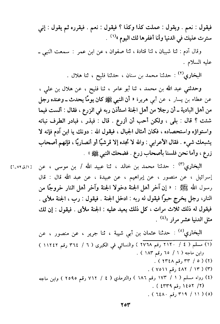 البُخَارِيّ: حَدثنَا مُحَمَّد بن خَالِد، ثَنَا عبيد الله / بن مُوسَى، عَن إِسْرَائِيل، عَن مَنْصُور، عَن إِبْرَاهِيم، عَن عُبَيْدَة، عَن عبد الله قَالَ: قَالَ رَسُول الله - صَلَّى اللَّهُ عَلَيْهِ وَسَلَّم َ -: " إِن آخر أهل الْجنَّة دُخُولا الْجنَّة وَآخر أهل النَّار خُرُوجًا من النَّار، رجل يخرج حبوا فَيَقُول لَهُ ربه: ادخل الْجنَّة. فَيَقُول: رب، الْجنَّة ملأى. فَيَقُول لَهُ ذَلِك ثَلَاث مَرَّات، كل ذَلِك يُعِيد عَلَيْهِ: الْجنَّة ملأى. فَيَقُول: إِن لَك مثل الدُّنْيَا عشر مرار ".