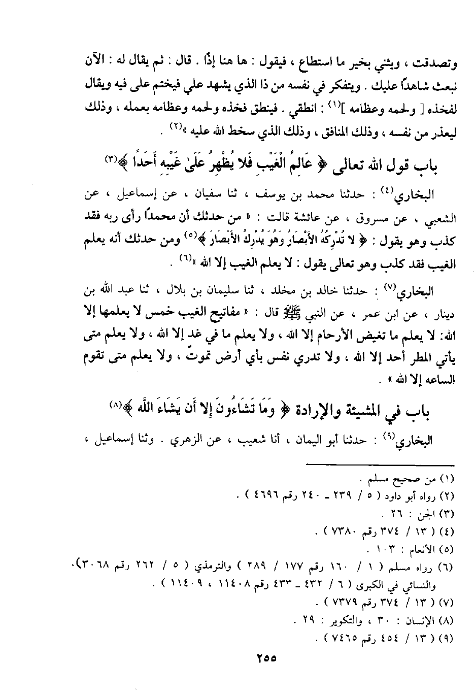 البُخَارِيّ: حَدثنَا مُحَمَّد بن يُوسُف، ثَنَا سُفْيَان، عَن إِسْمَاعِيل، عَن الشّعبِيّ، عَن مَسْرُوق، عَن عَائِشَة قَالَت: " من حَدثَك أَن مُحَمَّدًا رأى ربه فقد كذب وَهُوَ يَقُول: {لَا تُدْرِكهُ الْأَبْصَار وَهُوَ يدْرك الْأَبْصَار} وَمن حَدثَك أَنه يعلم الْغَيْب فقد كذب وَهُوَ تَعَالَى يَقُول: لَا يعلم الْغَيْب إِلَّا الله ".