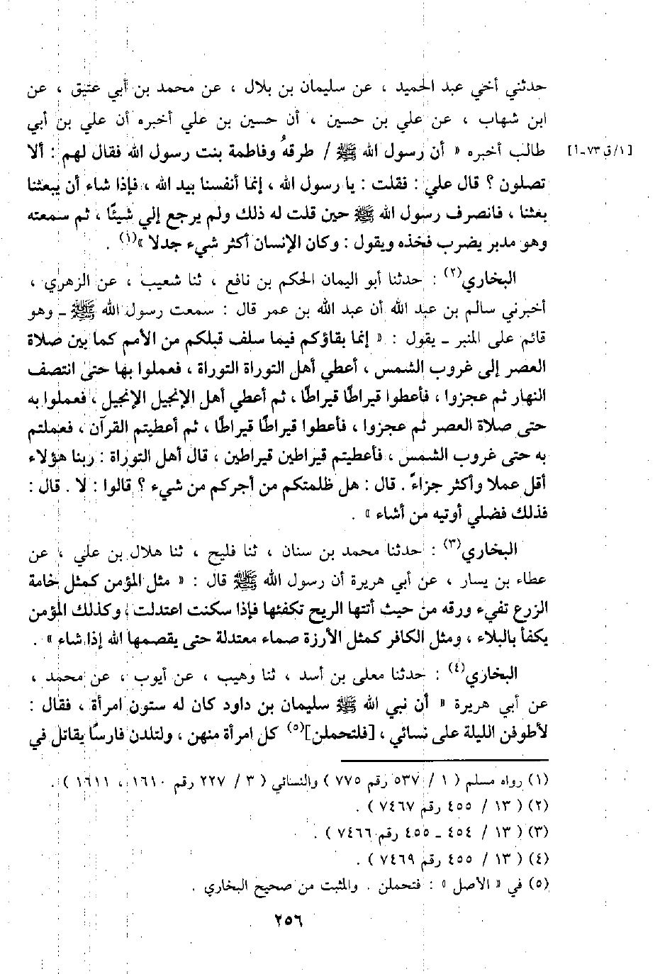 حَدثنِي أخي عبد الحميد، عَن سُلَيْمَان بن بِلَال، عَن مُحَمَّد بن أبي عَتيق، عَن ابْن شهَاب، عَن عَليّ بن حُسَيْن، أَن حُسَيْن بن عَليّ أخبرهُ أَن عَليّ بن أبي طَالب أخبرهُ " أَن رَسُول الله - صَلَّى اللَّهُ عَلَيْهِ وَسَلَّم َ - / طرقه وَفَاطِمَة بنت رَسُول الله فَقَالَ لَهُم: أَلا تصلونَ؟ قَالَ عَليّ: فَقلت: يَا رَسُول الله، إِنَّمَا أَنْفُسنَا بيد الله، فَإِذا شَاءَ أَن يبعثنا بعثنَا، فَانْصَرف رَسُول الله - صَلَّى اللَّهُ عَلَيْهِ وَسَلَّم َ - حِين قلت لَهُ ذَلِك وَلم يرجع إِلَيّ شَيْئا، ثمَّ سمعته وهومدبر يضْرب فَخذه وَيَقُول: وَكَانَ الْإِنْسَان أَكثر شَيْء جدلاً ".