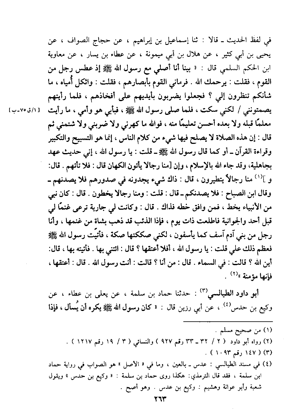 فِي لفظ الحَدِيث - قَالَا: ثَنَا إِسْمَاعِيل بن إِبْرَاهِيم، عَن حجاج الصَّواف، عَن يحيى بن أبي كثير، عَن هِلَال بن أبي مَيْمُونَة، عَن عَطاء بن يسَار، عَن مُعَاوِيَة ابْن الحكم السّلمِيّ قَالَ: " بَينا أَنا أُصَلِّي مَعَ رَسُول الله - صَلَّى اللَّهُ عَلَيْهِ وَسَلَّم َ - إِذْ عطس رجل من الْقَوْم، فَقلت: يَرْحَمك الله. فَرَمَانِي الْقَوْم بِأَبْصَارِهِمْ، فَقلت: واثكل أمِّياه، مَا شَأْنكُمْ تنْظرُون إِلَيّ؟ فَجعلُوا يضْربُونَ بِأَيْدِيهِم على أفخادهم، فَلَمَّا رَأَيْتهمْ يصمتونني / لكني سكت، فَلَمَّا صلى رَسُول الله - صَلَّى اللَّهُ عَلَيْهِ وَسَلَّم َ -، فبأبي هُوَ وَأمي، مَا رَأَيْت معلما قبله وَلَا بعده أحسن تَعْلِيما مِنْهُ، فوَاللَّه مَا كَهَرَنِي وَلَا ضَرَبَنِي وَلَا شَتَمَنِي ثمَّ قَالَ: إِن هَذِه الصَّلَاة لَا يصلح فِيهَا شَيْء من كَلَام النَّاس، إِنَّمَا هُوَ التَّسْبِيح وَالتَّكْبِير وَقِرَاءَة الْقُرْآن - أَو كَمَا قَالَ رَسُول الله - صَلَّى اللَّهُ عَلَيْهِ وَسَلَّم َ - قلت: يَا رَسُول الله، إِنِّي حَدِيث عهد بجاهلية، وَقد جَاءَ الله بِالْإِسْلَامِ، وَإِن [منا رجَالًا يأْتونَ الْكُهَّان قَالَ: فَلَا تأتيهم. قَالَ: و] منا رجَالًا يَتَطَيَّرُونَ، قَالَ: ذَاك شَيْء يجدونه فِي صُدُورهمْ فَلَا يصدنهم - وَقَالَ ابْن الصَّباح: فَلَا يصدنكم - قَالَ: قلت: وَمنا رجلا يخطون. قَالَ: كَانَ نَبِي من الْأَنْبِيَاء يخط، فَمن وَافق خطه فَذَاك. قَالَ: وَكَانَت لي جَارِيَة ترعى غنما لي قبل أحد والجوانية فاطلعت ذَات يَوْم، فَإِذا الذِّئْب قد ذهب بِشَاة من غنمها، وَأَنا رجل من بني آدم آسَف كَمَا يأسفون، لكني صَكَكْتهَا صَكَّة، فَأتيت رَسُول الله - صَلَّى اللَّهُ عَلَيْهِ وَسَلَّم َ - فَعظم ذَلِك عَليّ قلت: يَا رَسُول الله، أَفلا أعْتقهَا؟ قَالَ: ائْتِنِي بهَا. فَأَتَيْته بهَا، قَالَ أَيْن الله؟ قَالَت: فِي السَّمَاء. قَالَ: من أَنا؟ قَالَت: أَنْت رَسُول الله. قَالَ: أعْتقهَا، فَإِنَّهَا مُؤمنَة ".