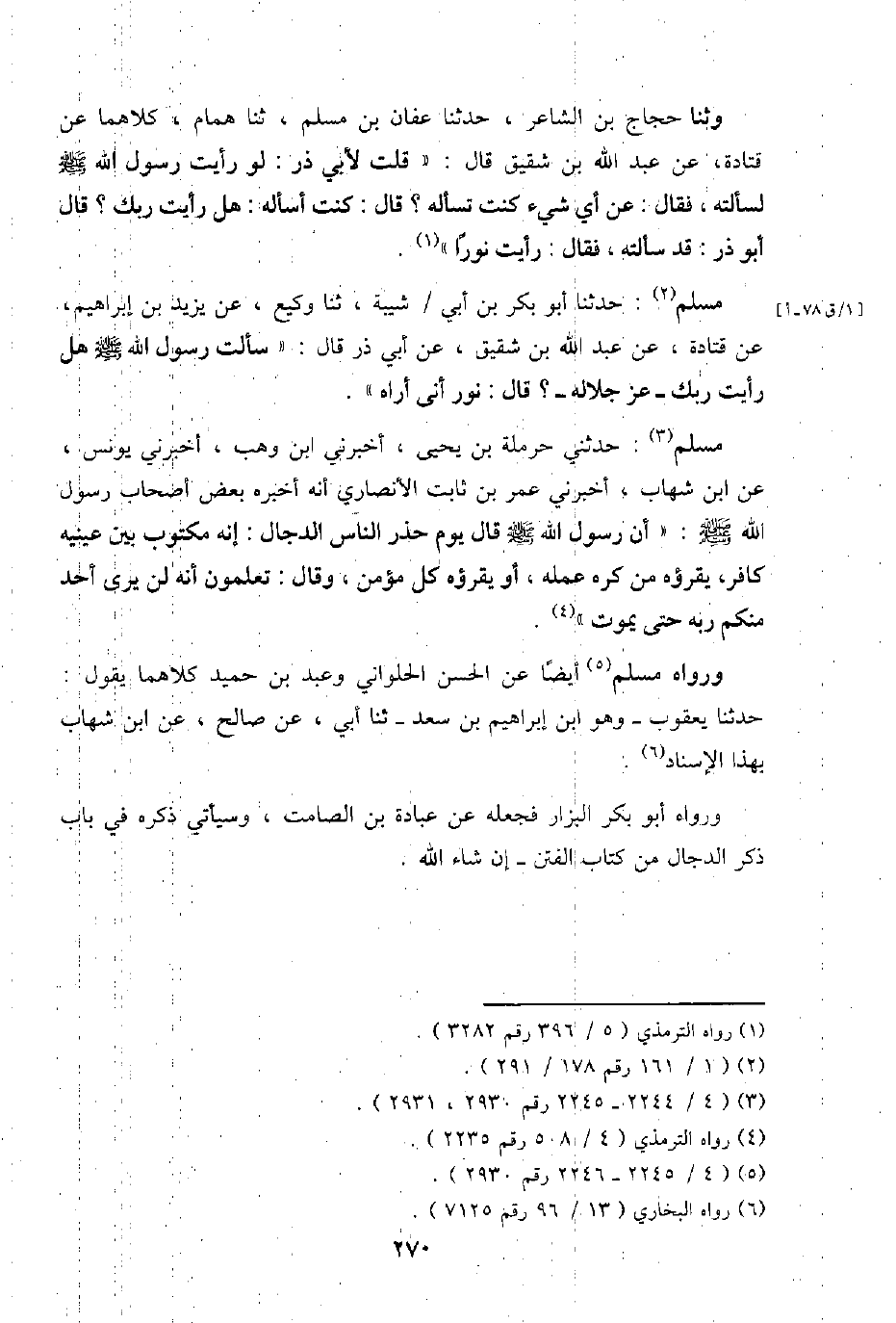 مُسلم: حَدثنَا أَبُو بكر بن أبي / شيبَة، ثَنَا وَكِيع، عَن يزِيد بن إِبْرَاهِيم، عَن قَتَادَة، عَن عبد الله بن شَقِيق، عَن أبي ذَر قَالَ: " سَأَلت رَسُول الله - صَلَّى اللَّهُ عَلَيْهِ وَسَلَّم َ - هَل رَأَيْت رَبك - عز جَلَاله -؟ قَالَ نور أَنى أرَاهُ ".