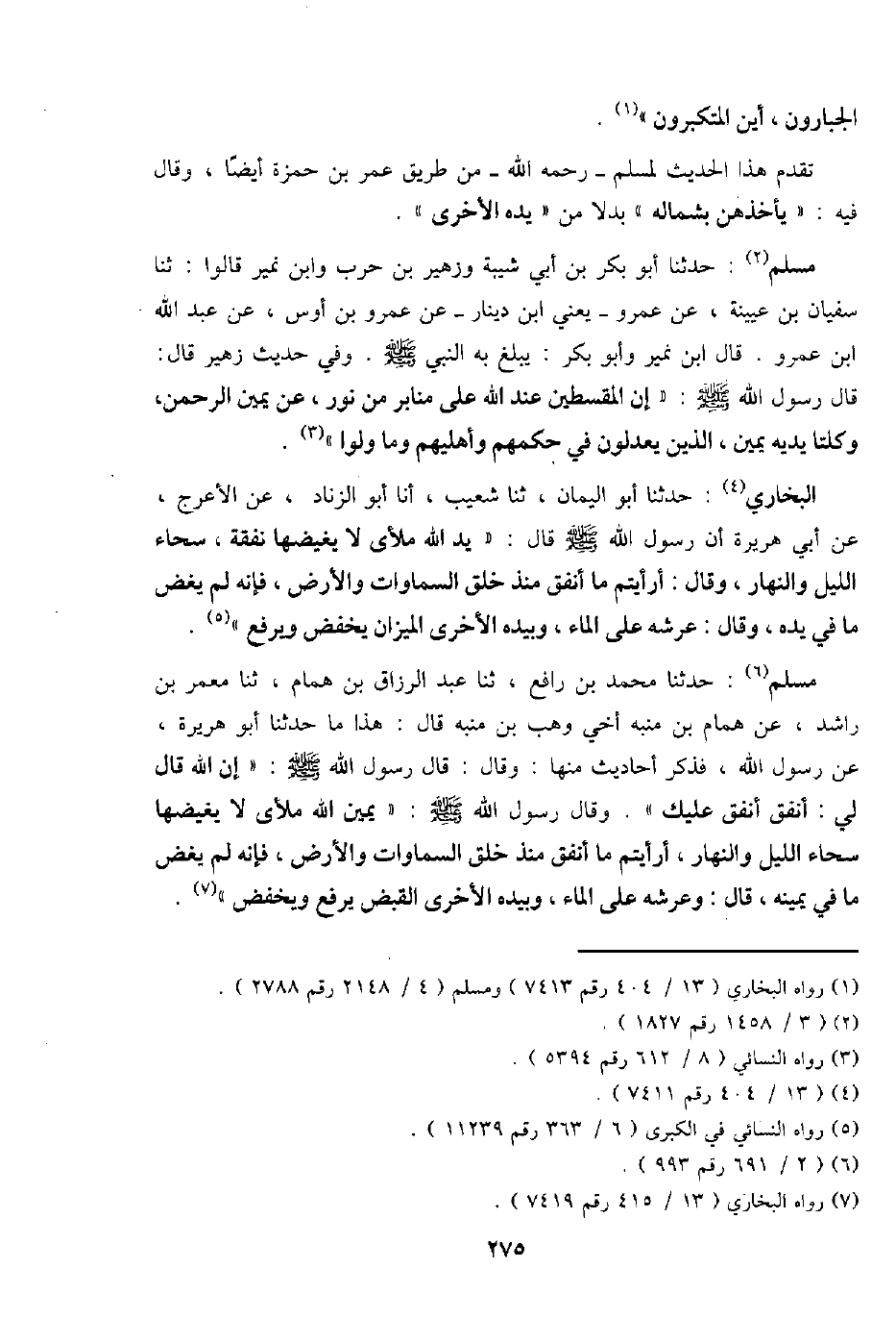 البُخَارِيّ: حَدثنَا أَبُو الْيَمَان، ثَنَا شُعَيْب، أَنا أَبُو الزِّنَاد، عَن الْأَعْرَج، عَن أبي هُرَيْرَة أَن رَسُول الله - صَلَّى اللَّهُ عَلَيْهِ وَسَلَّم َ - قَالَ: " يَد الله ملأى لَا يغيضها نَفَقَة، سحاء اللَّيْل وَالنَّهَار، وَقَالَ: أَرَأَيْتُم مَا أنْفق مُنْذُ خلق السَّمَاوَات وَالْأَرْض، فَإِنَّهُ لم يغض مَا فِي يَده. وَقَالَ: عَرْشه على المَاء، وَبِيَدِهِ الْأُخْرَى الْمِيزَان يخْفض وَيرْفَع ".