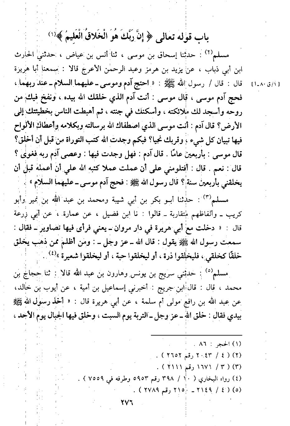 مُسلم: حَدثنَا إِسْحَاق بن مُوسَى، ثَنَا أنس بن عِيَاض، حَدثنِي الْحَارِث ابْن أبي ذُبَاب، عَن يزِيد بن هُرْمُز وَعبد الرَّحْمَن الْأَعْرَج قَالَا: سمعنَا أَبَا هُرَيْرَة قَالَ: قَالَ / رَسُول الله - صَلَّى اللَّهُ عَلَيْهِ وَسَلَّم َ -: " احْتج آدم ومُوسَى - عَلَيْهِمَا السَّلَام - عِنْد ربهما، فحج آدم مُوسَى، قَالَ مُوسَى: أَنْت آدم الَّذِي خلقك الله بِيَدِهِ، وَنفخ فِيك من روحه وأسجد لَك مَلَائكَته، وأسكنك فِي جنته، ثمَّ أهبطت النَّاس بخطيئتك إِلَى الآرض؟ قَالَ آدم: أَنْت مُوسَى الَّذِي اصطفاك الله برسالته وبكلامه وأعطاك الألواح فِيهَا تبيان كل شَيْء، وقربك نجيا؟ فبكم وجدت الله كتب التَّوْرَاة من قبل أَن أخلق؟ قَالَ مُوسَى: بِأَرْبَعِينَ عَاما. قَالَ آدم: فَهَل وجدت فِيهَا: وَعصى آدم ربه فغوى؟ قَالَ: نعم. قَالَ: أفتلومني على أَن عملت عملا كتبه الله عَليّ أَن أعمله قبل أَن يخلقني بِأَرْبَعِينَ سنة؟ قَالَ رَسُول الله - صَلَّى اللَّهُ عَلَيْهِ وَسَلَّم َ -: فحج آدم مُوسَى - عَلَيْهِمَا السَّلَام ".