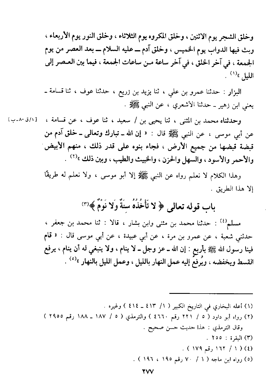 مُسلم: حَدثنَا مُحَمَّد بن مثنى وَابْن بشار، قَالَا: ثَنَا مُحَمَّد بن جَعْفَر، حَدثنِي شُعْبَة، عَن عَمْرو بن مرّة، عَن أبي عُبَيْدَة، عَن أبي مُوسَى قَالَ: " قَامَ فِينَا رَسُول الله - صَلَّى اللَّهُ عَلَيْهِ وَسَلَّم َ - بِأَرْبَع: إِن الله - عز وَجل - لَا ينَام، وَلَا يَنْبَغِي لَهُ أَن ينَام، يرفع الْقسْط وَيخْفِضهُ، وَيرْفَع إِلَيْهِ عمل النَّهَار بِاللَّيْلِ، وَعمل اللَّيْل بِالنَّهَارِ ".