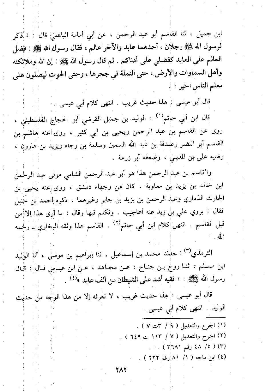 التِّرْمِذِيّ: حَدثنَا مُحَمَّد بن إِسْمَاعِيل، ثَنَا إِبْرَاهِيم بن مُوسَى، أَنا الْوَلِيد ابْن مُسلم، ثَنَا روح بن جنَاح، عَن مُجَاهِد، عَن ابْن عَبَّاس قَالَ: قَالَ رَسُول الله - صَلَّى اللَّهُ عَلَيْهِ وَسَلَّم َ -: " فَقِيه أَشد على الشَّيْطَان من ألف عَابِد ".