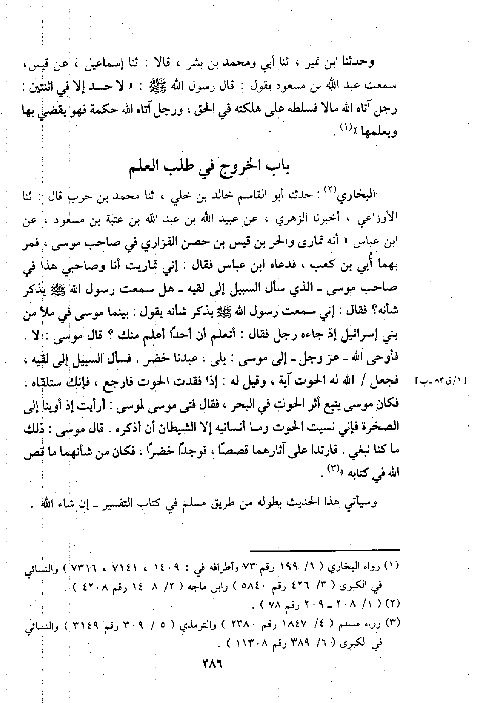 البُخَارِيّ: حَدثنَا أَبُو الْقَاسِم خَالِد بن خلي، ثَنَا مُحَمَّد بن حَرْب قَالَ: ثَنَا الْأَوْزَاعِيّ، أخبرنَا الزُّهْرِيّ، عَن عبيد الله بن عبد الله بن عتبَة بن مَسْعُود، عَن ابْن عَبَّاس " أَنه تمارى وَالْحر بن قيس بن حصن الْفَزارِيّ فِي صَاحب مُوسَى، فَمر بهما أبي بن كَعْب، فَدَعَاهُ ابْن عَبَّاس فَقَالَ: إِنِّي تماريت أَنا وصاحبي هَذَا فِي صَاحب مُوسَى - الَّذِي سَأَلَ السَّبِيل إِلَى لقِيه - هَل سَمِعت رَسُول الله - صَلَّى اللَّهُ عَلَيْهِ وَسَلَّم َ - يذكر شَأْنه؟ فَقَالَ: إِنِّي سَمِعت رَسُول الله - صَلَّى اللَّهُ عَلَيْهِ وَسَلَّم َ - يذكر شَأْنه يَقُول: بَيْنَمَا مُوسَى فِي مَلأ من بني إِسْرَائِيل إِذْ جَاءَهُ رجل فَقَالَ: أتعلم أَن أحدا أعلم مِنْك؟ قَالَ مُوسَى: لَا. فَأوحى الله - عز وَجل - إِلَى مُوسَى: بلَى، عَبدنَا خضر. فَسَأَلَ السَّبِيل إِلَى لقِيه، فَجعل / الله لَهُ الْحُوت آيَة، وَقيل لَهُ: إِذا فقدت الْحُوت فأرجع، فَإنَّك ستلقاه، فَكَانَ مُوسَى يتبع أثر الْحُوت فِي الْبَحْر، فَقَالَ فَتى مُوسَى لمُوسَى: أَرَأَيْت إِذْ أوينا إِلَى الصَّخْرَة فَإِنِّي نسيت الْحُوت وَمَا أنسانيه إِلَّا الشَّيْطَان أَن أذكرهُ. قَالَ مُوسَى: ذَلِك مَا كُنَّا نبغي. فارتدا على آثارهما قصصاً، فوجداً خضرًا، فَكَانَ من شَأْنهمَا مَا قصّ الله فِي كِتَابه ". وَسَيَأْتِي هَذَا الحَدِيث بِطُولِهِ من طَرِيق مُسلم فِي كتاب التَّفْسِير - إِن شَاءَ الله.