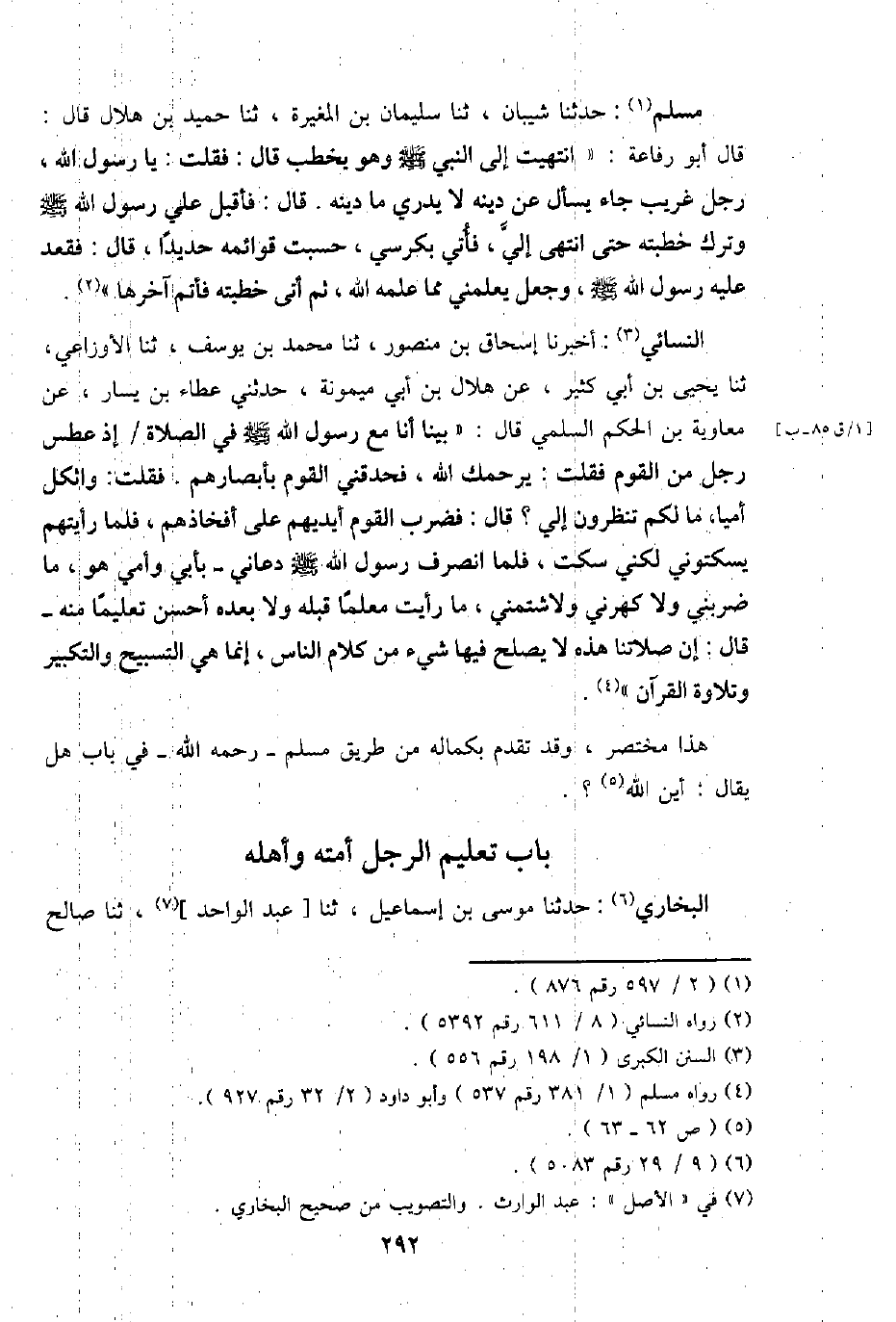 النَّسَائِيّ: أخبرنَا إِسْحَاق بن مَنْصُور، ثَنَا مُحَمَّد بن يُوسُف، ثَنَا الْأَوْزَاعِيّ، ثَنَا يحيى بن أبي كثير، عَن هِلَال بن أبي مَيْمُونَة، حَدثنِي عَطاء بن يسَار، عَن مُعَاوِيَة بن الحكم السّلمِيّ قَالَ: " بَينا أَنا مَعَ رَسُول الله - صَلَّى اللَّهُ عَلَيْهِ وَسَلَّم َ - فِي الصَّلَاة / إِذْ عطس رجل من الْقَوْم فَقلت: يَرْحَمك الله، فحدقني الْقَوْم بِأَبْصَارِهِمْ. فَقلت: واثكل أُمِّيا، مَا لكم تنْظرُون إِلَيّ؟ قَالَ: فَضرب الْقَوْم أَيْديهم على أَفْخَاذهم، فَلَمَّا رَأَيْتهمْ يسكتوني لكني سكت، فَلَمَّا انْصَرف رَسُول الله - صَلَّى اللَّهُ عَلَيْهِ وَسَلَّم َ - دَعَاني - بِأبي وَأمي هُوَ، مَا ضَرَبَنِي وَلَا كَهَرَنِي وَلَا شَتَمَنِي، مَا رَأَيْت معلما قبله وَلَا بعده أحسن تَعْلِيما مِنْهُ - قَالَ: إِن صَلَاتنَا هَذِه لَا يصلح فِيهَا شَيْء من كَلَام النَّاس، إِنَّمَا هِيَ التَّسْبِيح وَالتَّكْبِير وتلاوة الْقُرْآن ".