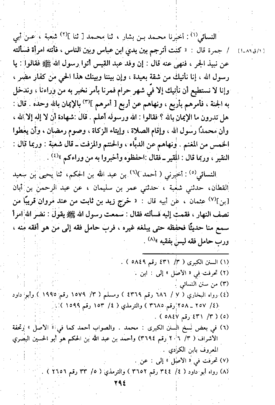 النَّسَائِيّ: أخبرنَا مُحَمَّد بن بشار، ثَنَا مُحَمَّد [ثَنَا] شُعْبَة، عَن أبي / جَمْرَة قَالَ: " كنت أترجم بَين يَدي ابْن عَبَّاس وَبَين النَّاس، فَأَتَتْهُ امْرَأَة فَسَأَلته عَن نَبِيذ الْجَرّ، فَنهى عَنهُ قَالَ: إِن وَفد عبر الْقَيْس أَتَوا رَسُول الله - صَلَّى اللَّهُ عَلَيْهِ وَسَلَّم َ - فَقَالُوا: يَا رَسُول الله، إِنَّا نَأْتِيك من شقة بعيدَة، وَإِن بَيْننَا وَبَيْنك هَذَا الْحَيّ من كفار مُضر، وَإِنَّا لَا نستطيع أَن نَأْتِيك إِلَّا فِي شهر حرَام فمرنا بِأَمْر نخبر بِهِ من وَرَاءَنَا، وندخل بِهِ الْجنَّة، فَأَمرهمْ بِأَرْبَع، ونهاهم عَن أَربع [أَمرهم] بِالْإِيمَان بِاللَّه وَحده. قَالَ: هلى تَدْرُونَ مَا الْإِيمَان بِاللَّه؟ فَقَالُوا: الله وَرَسُوله أعلم. قَالَ شَهَادَة أَن لَا إِلَه إِلَّا الله، وَأَن مُحَمَّدًا رَسُول الله، وإقام الصَّلَاة، وإيتاء الزَّكَاة، وَصَوْم رَمَضَان، وَأَن يُعْطوا الْخمس من الْمغنم. ونهاهم عَن الدُّبَّاء، والحنتم والمزفت - قَالَ شُعْبَة: وَرُبمَا قَالَ: النقير، وَرُبمَا قَالَ: المقير - فَقَالَ: احفظوه وأخبروا بِهِ من وراءكم ".