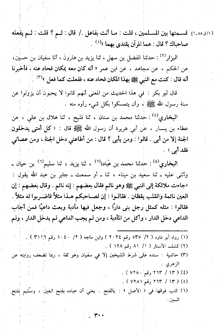 البُخَارِيّ: حَدثنَا مُحَمَّد بن عبَادَة، ثَنَا يزِيد، ثَنَا سليم بن حَيَّان - وَأثْنى عَلَيْهِ - ثَنَا سعيد بن ميناء، ثَنَا - أَو سَمِعت - جَابر بن عبد الله يَقُول: " جَاءَت مَلَائِكَة إِلَى النَّبِي - صَلَّى اللَّهُ عَلَيْهِ وَسَلَّم َ - وَهُوَ نَائِم فَقَالَ بَعضهم: إِنَّه نَائِم. , وَقَالَ بَعضهم: إِن الْعين نَائِمَة وَالْقلب يقظان. فَقَالُوا: إِن لصاحبكم هَذَا مثلا فاضربوا لَهُ مثلا. فَقَالُوا: مثله كَمثل رجل بنى دَارا، وَجعل فِيهَا مأدبة وَبعث دَاعيا فَمن أجَاب الدَّاعِي دخل الدَّار، وَأكل من المأدبة، وَمن لم يجب الدَّاعِي لم يدْخل الدَّار، وَلم