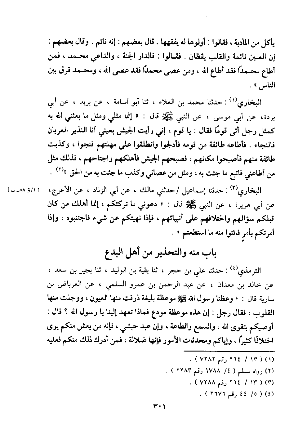 التِّرْمِذِيّ: حَدثنَا عَليّ بن حجر، ثَنَا بَقِيَّة بن الْوَلِيد، ثَنَا بجير بن سعد، عَن خَالِد بن معدان، عَن عبد الرَّحْمَن بن عَمْرو السّلمِيّ، عَن الْعِرْبَاض بن سَارِيَة قَالَ: " وعظنا رَسُول الله - صَلَّى اللَّهُ عَلَيْهِ وَسَلَّم َ - موعظة بليغة ذرفت مِنْهَا الْعُيُون، ووجلت مِنْهَا الْقُلُوب، فَقَالَ رجل: إِن هَذِه موعظة مُودع فَمَاذَا تعهد إِلَيْنَا يَا رَسُول الله؟ قَالَ: أوصيكم بتقوى الله، والسمع وَالطَّاعَة، وَإِن عبد حبشِي، فَإِنَّهُ من يَعش مِنْكُم يرى اخْتِلَافا كثيرا، وَإِيَّاكُم ومحدثات الْأُمُور فَإِنَّهَا ضَلَالَة، فَمن أدْرك ذَلِك مِنْكُم فَعَلَيهِ