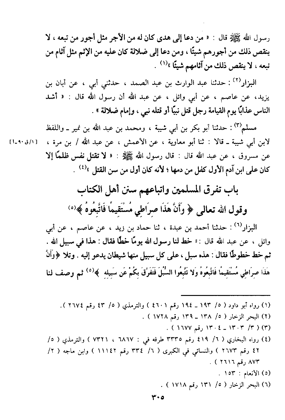 الْبَزَّار: حَدثنَا أَحْمد بن عَبدة، ثَنَا حَمَّاد بن زيد، عَن عَاصِم، عَن أبي وَائِل، عَن عبد الله قَالَ: " خطّ لنا رَسُول الله يَوْمًا خطا فَقَالَ: هَذَا فِي سَبِيل الله. ثمَّ خطّ خُطُوطًا فَقَالَ: هَذِه سبل، على كل سَبِيل مِنْهَا شَيْطَان يَدْعُو إِلَيْهِ. وتلا {وَأَن هَذَا صِرَاطِي مُسْتَقِيمًا فَاتَّبعُوهُ وَلَا تتبعوا السبل فَتفرق بكم عَن سَبيله} ثمَّ وصف لنا