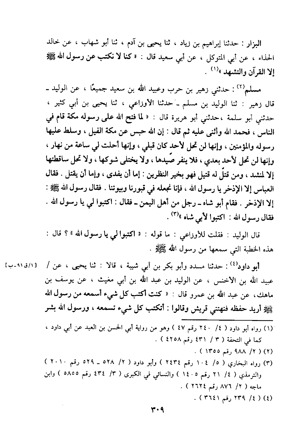 أَبُو دَاوُد: حَدثنَا مُسَدّد وَأَبُو بكر بن أبي شيبَة، قَالَا: ثَنَا يحيى، عَن / عبيد الله بن الْأَخْنَس، عَن الْوَلِيد بن عبد الله بن أبي مغيث، عَن يُوسُف بن مَاهك، عَن عبد الله بن عَمْرو قَالَ: " كنت أكتب كل شَيْء أسمعهُ من رَسُول الله - صَلَّى اللَّهُ عَلَيْهِ وَسَلَّم َ - أُرِيد حفظه فنهتني قُرَيْش وَقَالُوا: أتكتب كل شَيْء تسمعه، وَرَسُول الله بشر
