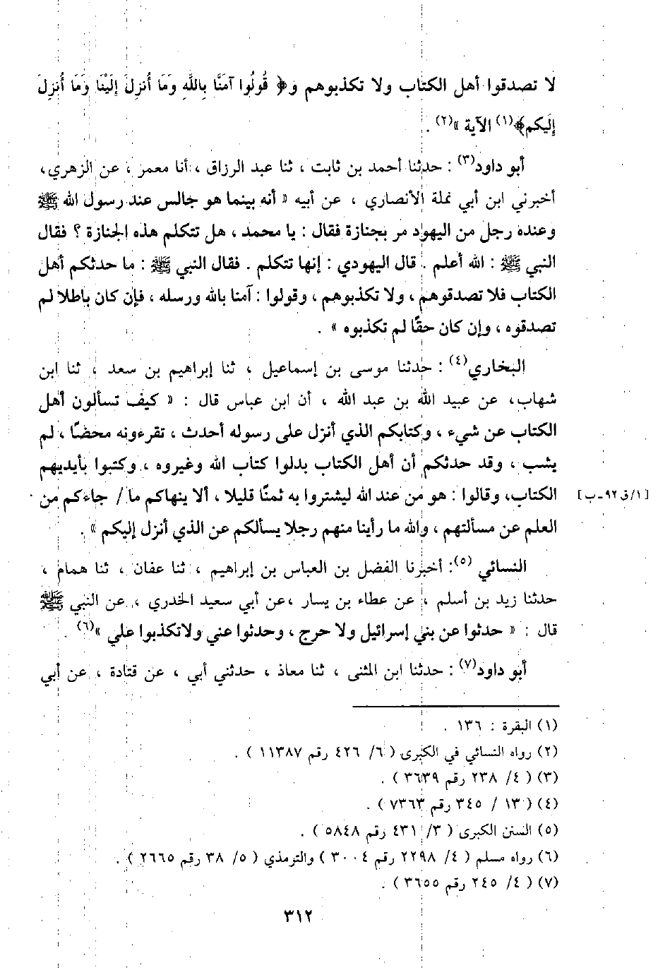 لَا تصدقوا أهل الْكتاب وَلَا تكذبوهم و {قُولُوا آمنا بِاللَّه وَمَا أنزل إِلَيْنَا وَمَا أنزل إِلَيْكُم} الْآيَة ".