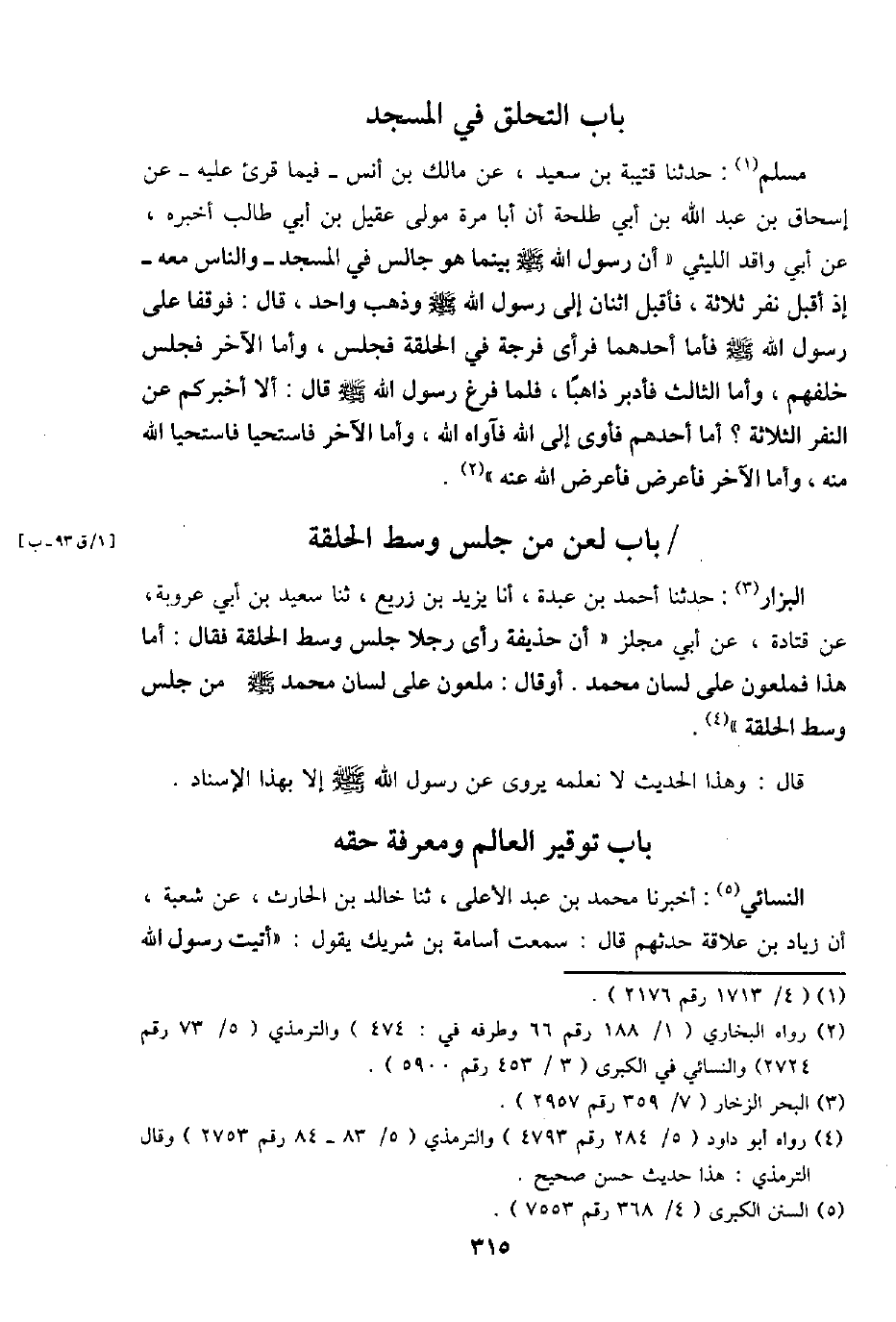 الْبَزَّار: حَدثنَا أَحْمد بن عَبدة، أَنا يزِيد بن زُرَيْع، ثَنَا سعيد بن أبي عرُوبَة، عَن قَتَادَة، عَن أبي مجلز " أَن حُذَيْفَة رأى رجلا جلس وسط الْحلقَة فَقَالَ: أما هَذَا فَمَلْعُون على لِسَان مُحَمَّد. أَو قَالَ: مَلْعُون على لِسَان مُحَمَّد - صَلَّى اللَّهُ عَلَيْهِ وَسَلَّم َ - من جلس وسط الْحلقَة ".