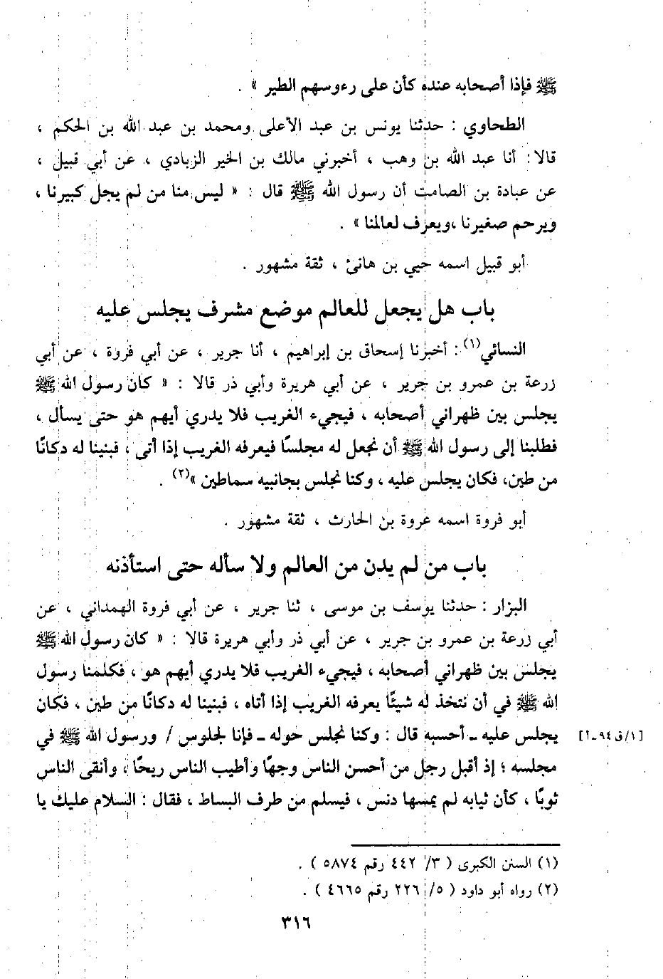 النَّسَائِيّ: أخبرنَا إِسْحَاق بن إِبْرَاهِيم، أَنا جرير، عَن أبي فَرْوَة، عَن أبي زرْعَة بن عَمْرو بن جرير، عَن أبي هُرَيْرَة وَأبي ذَر قَالَا: " كَانَ رَسُول الله - صَلَّى اللَّهُ عَلَيْهِ وَسَلَّم َ - يجلس بَين ظهراني أَصْحَابه، فَيَجِيء الْغَرِيب فَلَا يدْرِي أَيهمْ هُوَ حَتَّى يسْأَل، فطلبنا إِلَى رَسُول الله - صَلَّى اللَّهُ عَلَيْهِ وَسَلَّم َ - أَن نجْعَل لَهُ مَجْلِسا فيعرفه الْغَرِيب إِذا أَتَى، فبنينا لَهُ دكانا من طين، فَكَانَ يجلس عَلَيْهِ، وَكُنَّا نجلس بجانبيه سماطين ". أَبُو فَرْوَة اسْمه عُرْوَة بن الْحَارِث، ثِقَة مَشْهُور.
