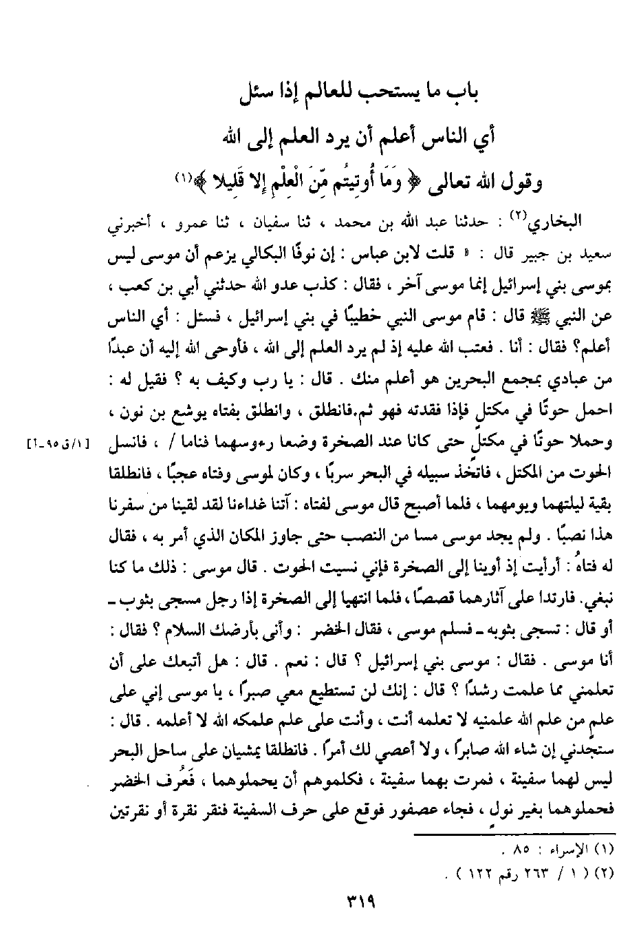 البُخَارِيّ: حَدثنَا عبد الله بن مُحَمَّد، ثَنَا سُفْيَان، ثَنَا عَمْرو، أَخْبرنِي سعيد بن جُبَير قَالَ: " قلت لِابْنِ عَبَّاس: إِن نَوْفًا الْبكالِي يزْعم أَن مُوسَى لَيْسَ بمُوسَى بني إِسْرَائِيل إِنَّمَا مُوسَى آخر، فَقَالَ: كذب عَدو الله حَدثنِي أبي بن كَعْب، عَن النَّبِي - صَلَّى اللَّهُ عَلَيْهِ وَسَلَّم َ - قَالَ: قَامَ مُوسَى النَّبِي خَطِيبًا فِي بني إِسْرَائِيل، فَسئلَ: أَي النَّاس أعلم؟ فَقَالَ: أَنا. فعتب الله عَلَيْهِ إِذْ لم يرد الْعلم إِلَى الله، فَأوحى الله إِلَيْهِ أَن عبدا من عبَادي بمجمع الْبَحْرين هُوَ أعلم مِنْك. قَالَ: يَا رب وَكَيف بِهِ؟ فَقيل لَهُ: احْمِلْ حوتاً فِي مكتل فَإِذا فقدته فَهُوَ ثمَّ فَانْطَلق، وَانْطَلق بفتاة يُوشَع بن نون، وحملا حوتا فِي مكتل حَتَّى كَانَا عِنْد الصَّخْرَة وضعا رءوسهما فَنَامَا /، فانسل الْحُوت من المكتل، فَاتخذ سَبيله فِي الْبَحْر سرباً، وَكَانَ لمُوسَى وفتاه عجبا، فَانْطَلقَا بَقِيَّة ليلتهما ويومها، فَلَمَّا أصبح قَالَ مُوسَى لفتاه: آتنا غداءنا لقد لَقينَا من سفرنا هَذَا نصبا. وَلم يجد مُوسَى مسا من النصب حَتَّى جَاوز الْمَكَان الَّذِي أَمر بِهِ، فَقَالَ لَهُ فتاه: أَرَأَيْت إِذْ أوينا إِلَى الصَّخْرَة فَإِنِّي نسيت الْحُوت. قَالَ مُوسَى: ذَلِك مَا كُنَّا نبغي. فارتدا على آثارهما قصصاً، فَلَمَّا انتهيا إِلَى الصَّخْرَة إِذا رجل مسجى بِثَوْب - أَو قَالَ: تسجى بِثَوْبِهِ - فَسلم مُوسَى، فَقَالَ الْخضر: وَأَنِّي بأرضك السَّلَام؟ فَقَالَ: أَنا مُوسَى. فَقَالَ: مُوسَى بني إِسْرَائِيل؟ قَالَ: نعم. قَالَ: هَل أتبعك على أَن تعلمني مِمَّا علمت رشدا؟ قَالَ: إِنَّك لن تَسْتَطِيع معي صبرا، يَا مُوسَى إِنِّي على علم من علم الله علمنيه لَا تعلمه أَنْت، وَأَنت على علم علمكه الله لَا أعلمهُ. قَالَ: ستجدني إِن شَاءَ الله صَابِرًا، وَلَا أعصي لَك أمرا. فَانْطَلقَا يمشيان على سَاحل الْبَحْر لَيْسَ لَهما سفينة، فمرت بهما سفينة، فلكموهم أَن يحملوهما، فَعرف الْخضر فحملوهما بِغَيْر نول، فجَاء عُصْفُور فَوَقع على حرف السَّفِينَة فَنقرَ نقرة أَو نقرتين