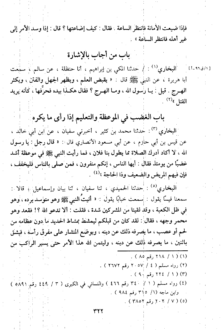 البُخَارِيّ: / حَدثنَا الْمَكِّيّ بن إِبْرَاهِيم، أَنا حَنْظَلَة، عَن سَالم، سَمِعت أَبَا هُرَيْرَة، عَن النَّبِي - صَلَّى اللَّهُ عَلَيْهِ وَسَلَّم َ - قَالَ: " يقبض الْعلم، وَيظْهر الْجَهْل والفتن، وَيكثر الْهَرج. قيل: يَا رَسُول الله، وَمَا الْهَرج؟ فَقَالَ هَكَذَا بِيَدِهِ فحرفها، كَأَنَّهُ يُرِيد الْقَتْل ".