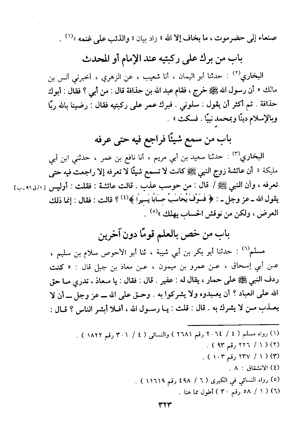 البُخَارِيّ: حَدثنَا سعيد بن أبي مَرْيَم، أَنا نَافِع بن عمر، حَدثنِي ابْن أبي مليكَة " أَن عَائِشَة زوج النَّبِي - صَلَّى اللَّهُ عَلَيْهِ وَسَلَّم َ - كَانَت لَا تسمع شَيْئا لَا تعرفه إِلَّا راجعت فِيهِ حَتَّى تعرفه، وَأَن النَّبِي - صَلَّى اللَّهُ عَلَيْهِ وَسَلَّم َ - / قَالَ: من حُوسِبَ عذب. قَالَت عَائِشَة: فَقلت: أوليس يَقُول الله - عز وَجل: {فَسَوف يُحَاسب حسابا يَسِيرا} قَالَت: فَقَالَ: إِنَّمَا ذَلِك الْعرض، وَلَكِن من نُوقِشَ الْحساب يهْلك ".