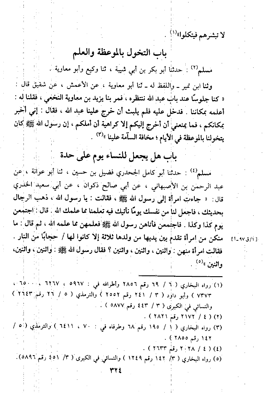 مُسلم: حَدثنَا أَبُو كَامِل الجحدري فُضَيْل بن حُسَيْن، ثَنَا أَبُو عوَانَة، عَن عبد الرَّحْمَن بن الْأَصْبَهَانِيّ، عَن أبي صَالح ذكْوَان، عَن أبي سعيد الْخُدْرِيّ قَالَ: " جَاءَت أمْرَأَة إِلَى رَسُول الله - صَلَّى اللَّهُ عَلَيْهِ وَسَلَّم َ -، فَقَالَت: يَا رَسُول الله، ذهب الرِّجَال بحديثك، فَاجْعَلْ لنا من نَفسك يَوْمًا نَأْتِيك فِيهِ تعلمنا مِمَّا علمك الله. قَالَ: اجْتَمعْنَ يَوْم كَذَا وَكَذَا. فاجتمعن فأتاهن رَسُول الله - صَلَّى اللَّهُ عَلَيْهِ وَسَلَّم َ - فعلمهن مِمَّا علمه الله، ثمَّ قَالَ: مَا مِنْكُن من امْرَأَة تقدم بَين يَديهَا من وَلَدهَا ثَلَاثَة إِلَّا كَانُوا لَهَا / حِجَابا من النَّار. فَقَالَت امْرَأَة مِنْهُنَّ: واثنين، واثنين، واثنين؟ فَقَالَ رَسُول الله - صَلَّى اللَّهُ عَلَيْهِ وَسَلَّم َ -: واثنين، واثنين، واثنين ".