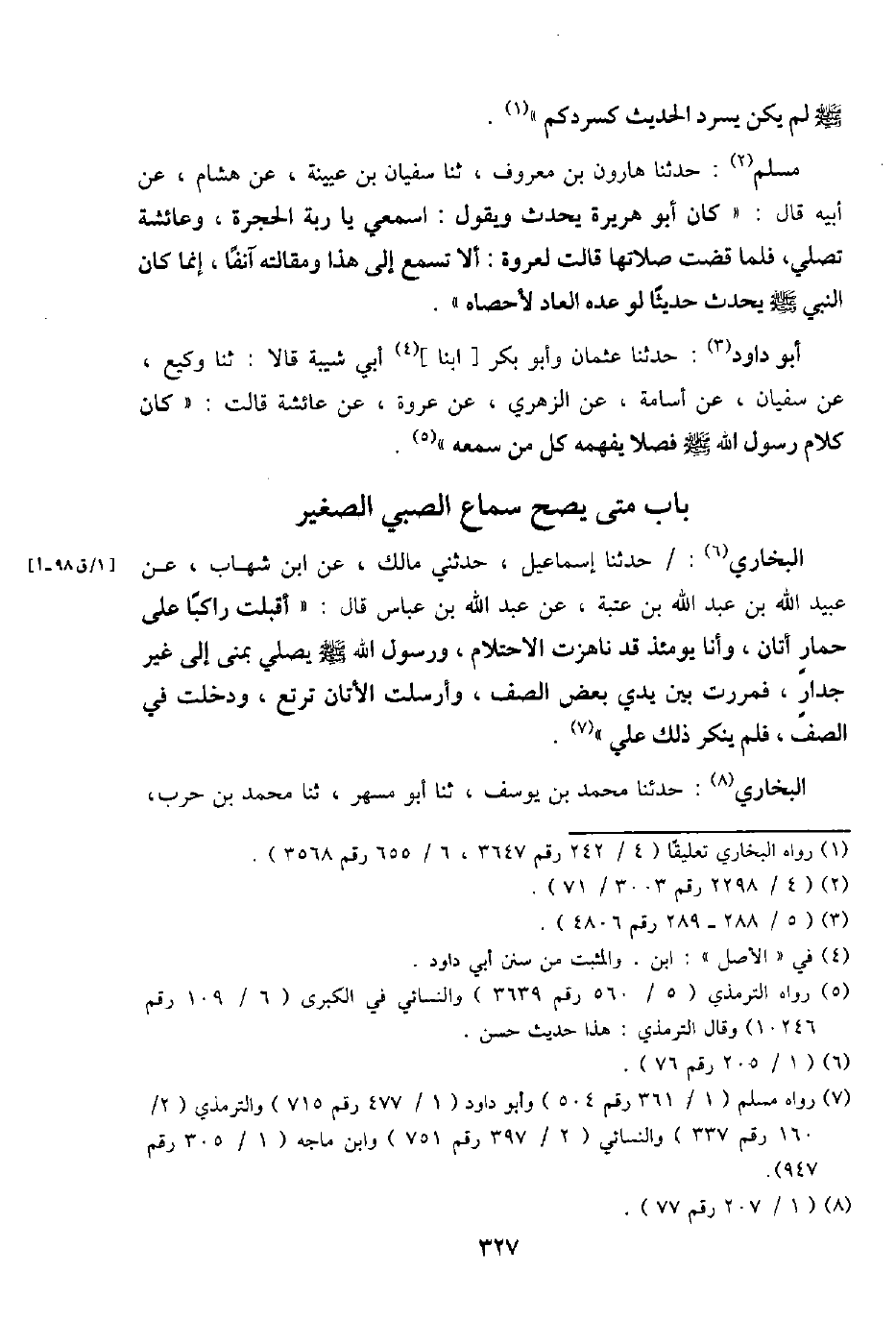 مُسلم: حَدثنَا هَارُون بن مَعْرُوف، ثَنَا سُفْيَان بن عُيَيْنَة، عَن هِشَام، عَن أَبِيه قَالَ: " كَانَ أ [وهُرَيْرَة يحدث وَيَقُول: اسمعي يَا ربة الْحُجْرَة، وَعَائِشَة تصلي، فَلَمَّا قَضَت صلَاتهَا قَالَت لعروة: أَلا تسمع إِلَى هَذَا ومقالته آنِفا، إِنَّمَا كَانَ النَّبِي