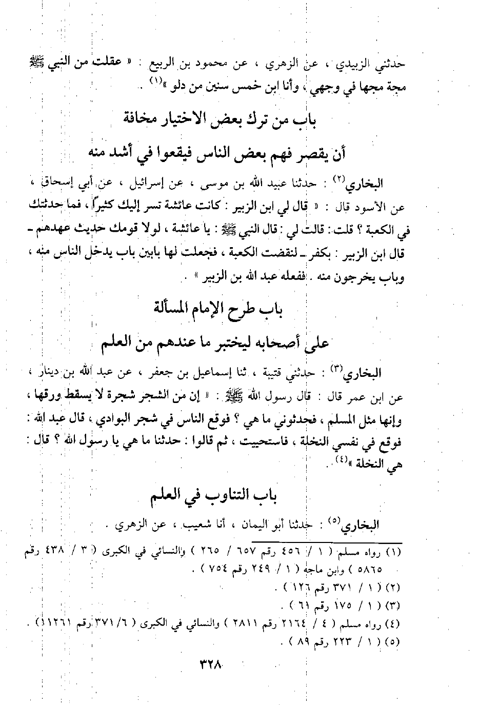 حَدثنِي الزبيدِيّ، عَن الزُّهْرِيّ، عَن مَحْمُود بن الرّبيع: " عقلت من النَّبِي - صَلَّى اللَّهُ عَلَيْهِ وَسَلَّم َ - مجة مجها فِي وَجْهي، وَأَنا ابْن خمس سِنِين من دلو ".