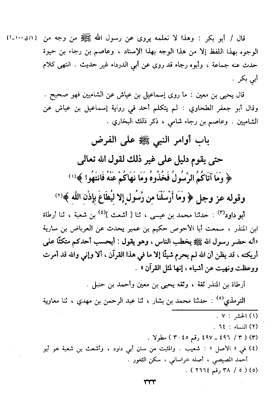 أَبُو دَاوُد: حَدثنَا مُحَمَّد بن عِيسَى، ثَنَا [أَشْعَث] بن شُعْبَة، ثَنَا أَرْطَاة ابْن الْمُنْذر، سَمِعت أَبَا الْأَحْوَص حَكِيم بن عُمَيْر يحدث عَن الْعِرْبَاض بن سَارِيَة " أَنه حضر رَسُول الله - صَلَّى اللَّهُ عَلَيْهِ وَسَلَّم َ - يخْطب النَّاس، وَهُوَ يَقُول: أيحسب أحدكُم مُتكئا على أريكته، قد يظنّ أَن الله لم يحرم شَيْئا إِلَّا مَا فِي هَذَا الْقُرْآن، أَلا وَإِنِّي وَالله قد أمرت ووعظت ونهيت عَن أَشْيَاء، إِنَّهَا لمثل الْقُرْآن ".