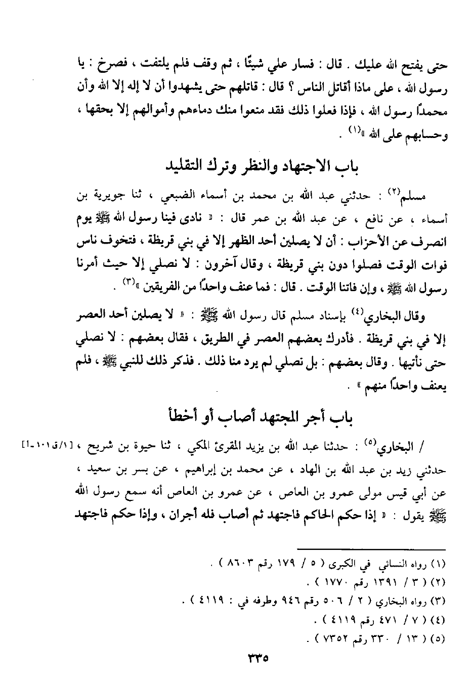 مُسلم: حَدثنِي عبد الله بن مُحَمَّد بن أَسمَاء الضبعِي، ثَنَا جوَيْرِية بن أَسمَاء، عَن نَافِع، عَن عبد الله بن عمر قَالَ: " نَادَى فِينَا رَسُول الله - صَلَّى اللَّهُ عَلَيْهِ وَسَلَّم َ - يَوْم انْصَرف عَن الْأَحْزَاب: أَن لَا يصلين أحد الظّهْر إِلَّا فِي بني قُرَيْظَة، فتخوف نَاس فَوَات الْوَقْت فصلوا دون بني قُرَيْظَة، وَقَالَ آخَرُونَ: لَا نصلي إِلَّا حَيْثُ أمرنَا رَسُول الله - صَلَّى اللَّهُ عَلَيْهِ وَسَلَّم َ -، وَإِن فاتنا الْوَقْت. قَالَ: فَمَا عنف وَاحِدًا من الْفَرِيقَيْنِ ".