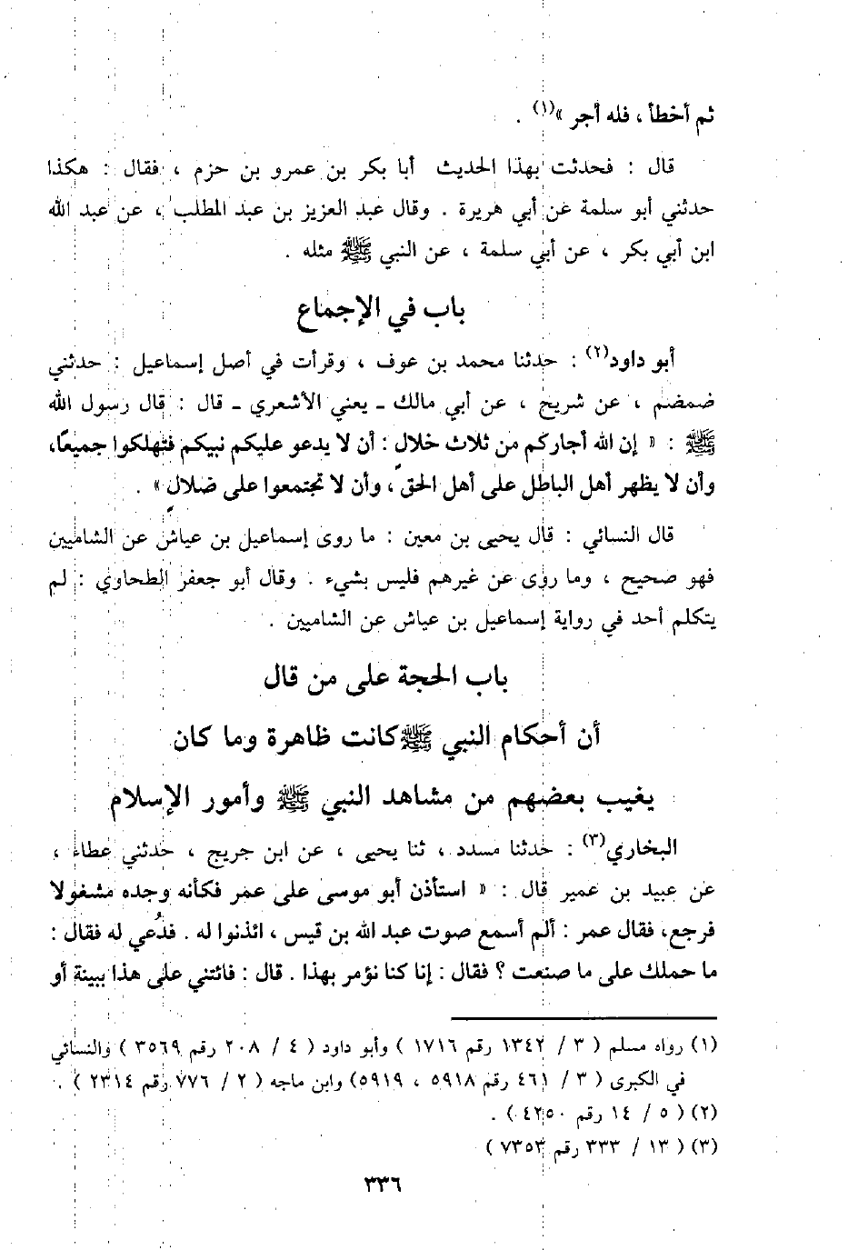أَبُو دَاوُد: حَدثنَا مُحَمَّد بن عَوْف، وقرأت فِي أصل إِسْمَاعِيل: حَدثنِي ضَمْضَم، عَن شُرَيْح، عَن أبي مَالك - يَعْنِي الْأَشْعَرِيّ - قَالَ: قَالَ رَسُول الله - صَلَّى اللَّهُ عَلَيْهِ وَسَلَّم َ -: " إِن الله أجاركم من ثَلَاث خلال: أَن لَا يَدْعُو عَلَيْكُم نَبِيكُم فَتَهْلكُوا جَمِيعًا، وَأَن لَا يظْهر أهل الْبَاطِل على أهل الْحق، وَأَن لَا تجتمعوا على ضلال ".