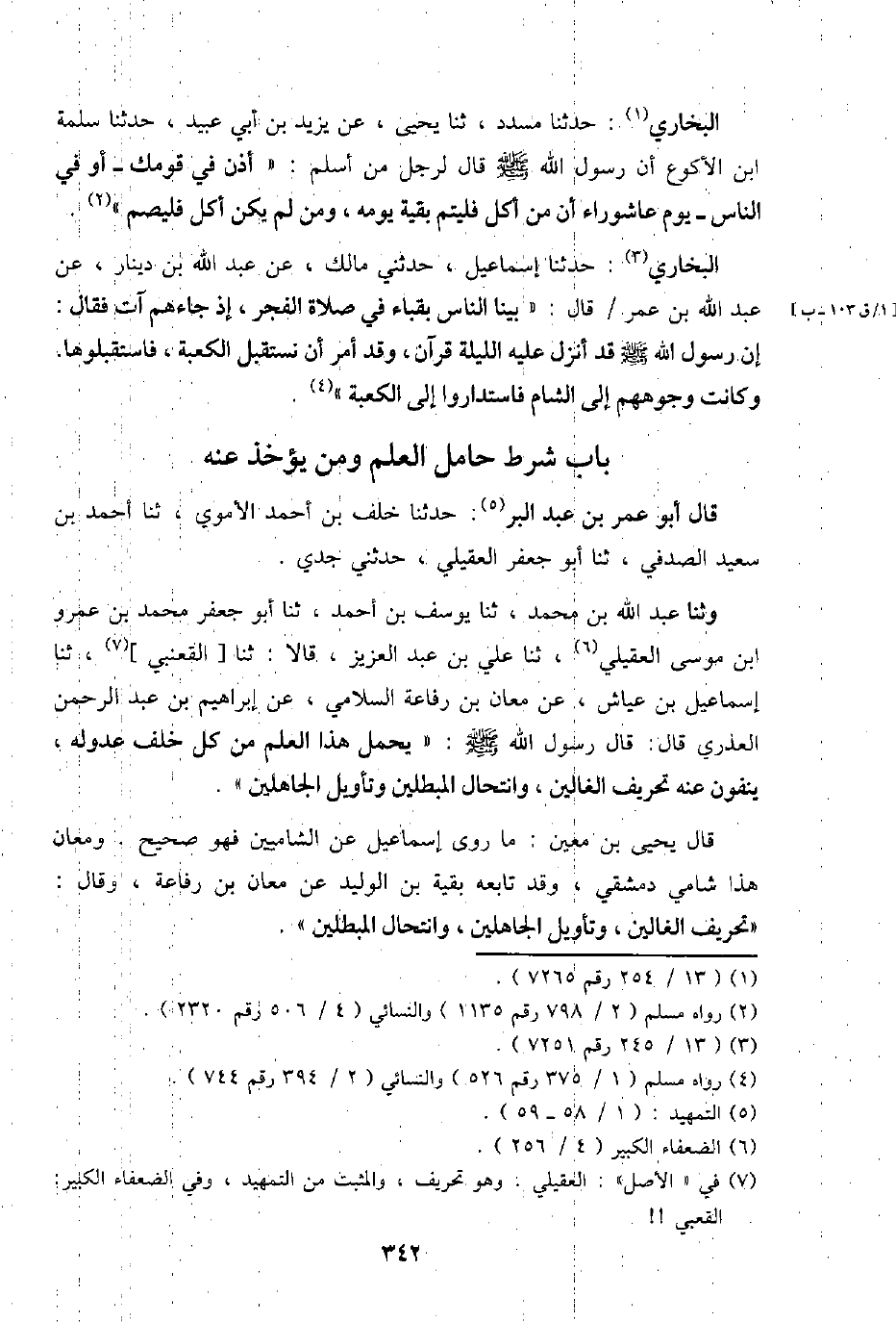 وثنا عبد الله بن مُحَمَّد، ثَنَا يُوسُف بن أَحْمد، ثَنَا أَبُو جَعْفَر مُحَمَّد بن عَمْرو ابْن مُوسَى الْعقيلِيّ، ثَنَا عَليّ بن عبد الْعَزِيز، قَالَا: ثَنَا [القعْنبِي] ، ثَنَا إِسْمَاعِيل بن عَيَّاش، عَن معَان بن رِفَاعَة السلَامِي، عَن إِبْرَاهِيم بن عبد الرَّحْمَن العذري قَالَ: قَالَ رَسُول الله - صَلَّى اللَّهُ عَلَيْهِ وَسَلَّم َ -: " يحمل هَذَا الْعلم من كل خلف عدوله، ينفون عَنهُ تَحْرِيف الغالين، وانتحال المبطلين وَتَأْويل الْجَاهِلين ".