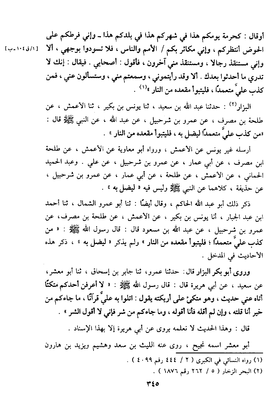 الْبَزَّار: حَدثنَا عبد الله بن سعيد، ثَنَا يُونُس بن بكير، ثَنَا الْأَعْمَش، عَن طَلْحَة بن مصرف، عَن عَمْرو بن شُرَحْبِيل، عَن عبد الله، عَن النَّبِي - صَلَّى اللَّهُ عَلَيْهِ وَسَلَّم َ - قَالَ: " من كذب عَليّ مُتَعَمدا، ليضل بِهِ فَليَتَبَوَّأ مَقْعَده من النَّار ".