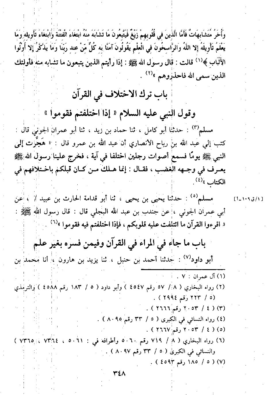 مُسلم: حَدثنَا أَبُو كَامِل، ثَنَا حَمَّاد بن زيد، ثَنَا أَبُو عمرَان الْجونِي قَالَ: كتب إِلَيّ عبد الله بن رَبَاح الْأنْصَارِيّ أَن عبد الله بن عَمْرو قَالَ: " هجرت إِلَى النَّبِي - صَلَّى اللَّهُ عَلَيْهِ وَسَلَّم َ - يَوْمًا فَسمع أصوات رجلَيْنِ اخْتلفَا فِي آيَة، فَخرج علينا رَسُول الله - صَلَّى اللَّهُ عَلَيْهِ وَسَلَّم َ - يعرف فِي وَجهه الْغَضَب، فَقَالَ: إِنَّمَا هلك من كَانَ قبلكُمْ باختلافهم فِي الْكتاب ".