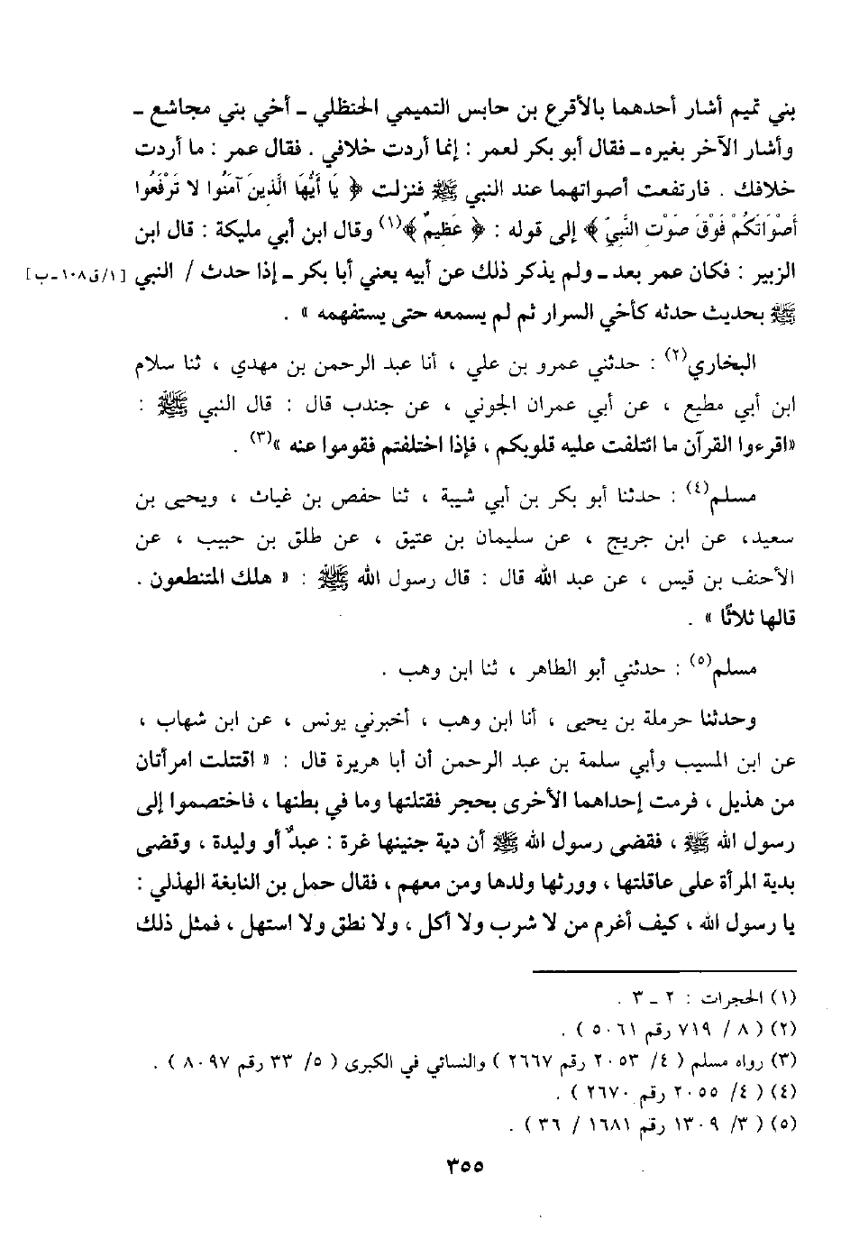 بني تَمِيم أَشَارَ أَحدهمَا بالأقرع بن حَابِس التَّمِيمِي الْحَنْظَلِي - أخي بني مجاشع - وَأَشَارَ الآخر بِغَيْرِهِ - فَقَالَ أَبُو بكر لعمر: إِنَّمَا أردْت خلافي. فَقَالَ عمر: مَا أردْت خِلافك. فارتفعت أصواتهما عِنْد النَّبِي - صَلَّى اللَّهُ عَلَيْهِ وَسَلَّم َ - فَنزلت {يَا أَيهَا الَّذين آمنُوا لَا تَرفعُوا أَصْوَاتكُم فَوق صَوت النَّبِي} إِلَى قَوْله: {عَظِيم} وَقَالَ ابْن أبي مليكَة: قَالَ ابْن الزبير: فَكَانَ عمر بعد - وَلم يذكر ذَلِك عَن أَبِيه يَعْنِي أَبَا بكر - إِذا حدث / النَّبِي - صَلَّى اللَّهُ عَلَيْهِ وَسَلَّم َ - بِحَدِيث حَدثهُ كَأَخِي السرَار ثمَّ لم يسمعهُ حَتَّى يَسْتَفْهِمهُ ".