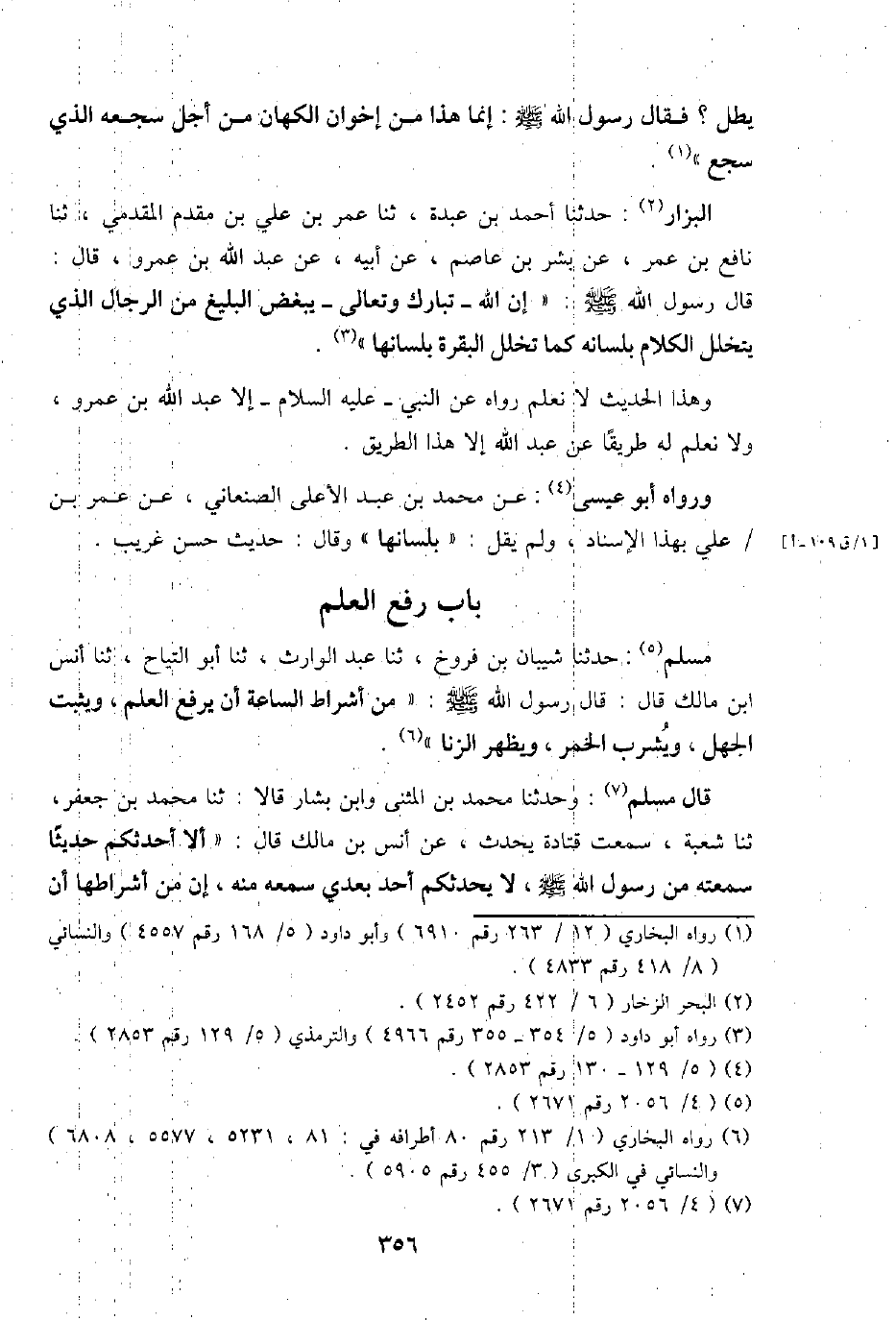 الْبَزَّار: حَدثنَا أَحْمد بن عَبدة، ثَنَا عمر بن عَليّ بن مقدم الْمقدمِي، ثَنَا نَافِع بن عمر، عَن بشر بن عَاصِم، عَن أَبِيه، عَن عبد الله بن عَمْرو، قَالَ: قَالَ رَسُول الله - صَلَّى اللَّهُ عَلَيْهِ وَسَلَّم َ -: " إِن الله - تبَارك وَتَعَالَى - يبغض البليغ من الرِّجَال الَّذِي يَتَخَلَّل الْكَلَام بِلِسَانِهِ كَمَا تخَلّل الْبَقَرَة بلسانها ".