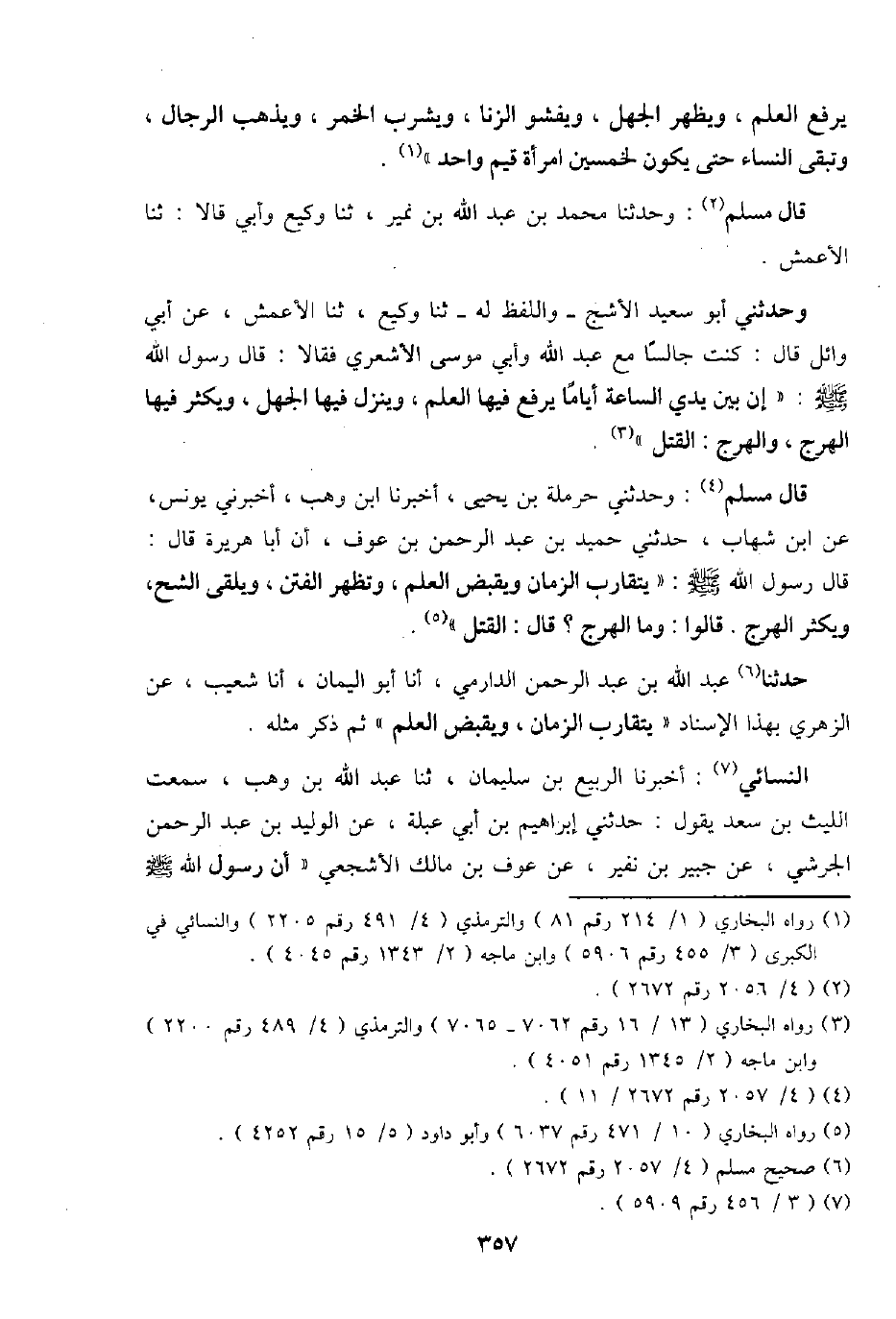قَالَ مُسلم: وحَدثني حَرْمَلَة بن يحيى، أخبرنَا ابْن وهب، أَخْبرنِي يُونُس، عَن ابْن شهَاب، حَدثنِي حميد بن عبد الرَّحْمَن بن عَوْف، أَنا أَبَا هُرَيْرَة قَالَ: قَالَ رَسُول الله - صَلَّى اللَّهُ عَلَيْهِ وَسَلَّم َ -: " يتقارب الزَّمَان وَيقبض الْعلم، وَتظهر الْفِتَن، ويلقى الشُّح، وَيكثر الْهَرج. قَالُوا: وَمَا الْهَرج؟ قَالَ: الْقَتْل ".