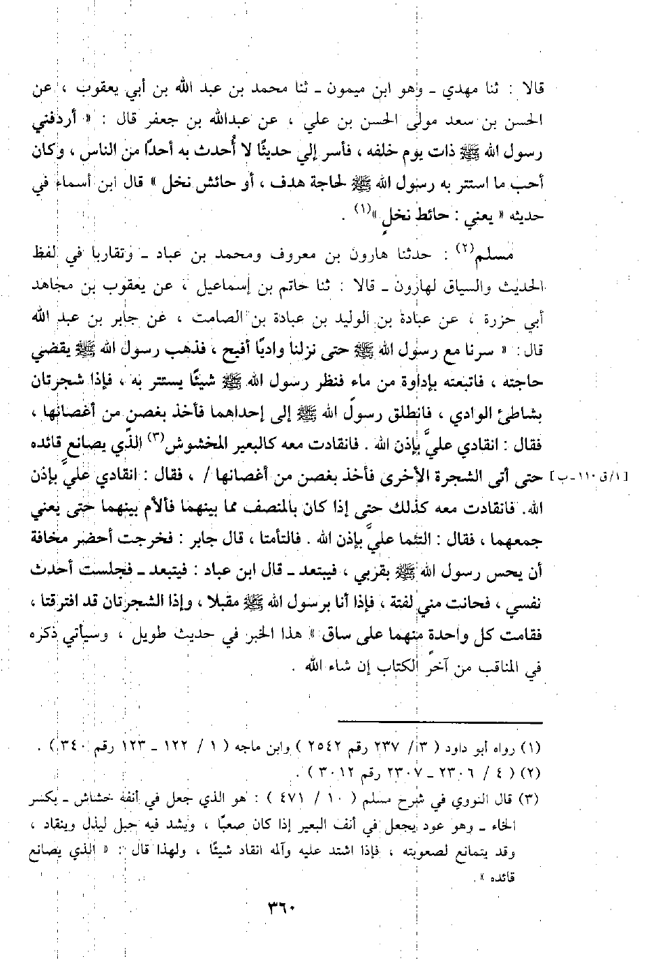 مُسلم: حَدثنَا هَارُون بن مَعْرُوف وَمُحَمّد بن عباد - وتقاربا فِي لفظ الحَدِيث والسياق لهارون - قَالَا: ثَنَا حَاتِم بن إِسْمَاعِيل، عَن يَعْقُوب بن مُجَاهِد أبي حرزة، عَن عبَادَة بن الْوَلِيد بن عبَادَة بن الصَّامِت، عَن جَابر بن عبد الله قَالَ: " سرنا مَعَ رَسُول الله - صَلَّى اللَّهُ عَلَيْهِ وَسَلَّم َ - حَتَّى نزلنَا وَاديا أفيح، فَذهب رَسُول الله - صَلَّى اللَّهُ عَلَيْهِ وَسَلَّم َ - يقْضِي حَاجته، فاتبعته بإداوة من مَاء فَنظر رَسُول الله - صَلَّى اللَّهُ عَلَيْهِ وَسَلَّم َ - شَيْئا يسْتَتر بِهِ، فَإِذا شجرتان بشاطئ الْوَادي، فَانْطَلق رَسُول الله - صَلَّى اللَّهُ عَلَيْهِ وَسَلَّم َ - إِلَى إِحْدَاهمَا فَأخذ بِغُصْن من أَغْصَانهَا، فَقَالَ: انقادي عَليّ بِإِذن الله. فانقادت مَعَه كالبعير المخشوش الَّذِي يصانع قائده حَتَّى أَتَى الشَّجَرَة الْأُخْرَى فَأخذ بِغُصْن من أَغْصَانهَا /، فَقَالَ: انقادي عَليّ بِإِذن الله. فانقادت مَعَه كَذَلِك حَتَّى إِذا كَانَ بالمنصف مِمَّا بَينهمَا فالأم بَينهمَا حَتَّى يَعْنِي جَمعهمَا، فَقَالَ: التئما عَليّ بِإِذن الله. فالتأما، قَالَ جَابر: فَخرجت أحضر مَخَافَة أَن يحس رَسُول الله - صَلَّى اللَّهُ عَلَيْهِ وَسَلَّم َ - بقربي، فيبتعد - قَالَ ابْن عباد: فيتبعد - فَجَلَست أحدث نَفسِي، فحانت مني لفتة، فَإِذا أَنا برَسُول الله - صَلَّى اللَّهُ عَلَيْهِ وَسَلَّم َ - مُقبلا، وَإِذا الشجرتان قد افترقتا، فَقَامَتْ كل وَاحِدَة مِنْهُمَا على سَاق " هَذَا الْخَبَر فِي حَدِيث طَوِيل، وَسَيَأْتِي ذكره