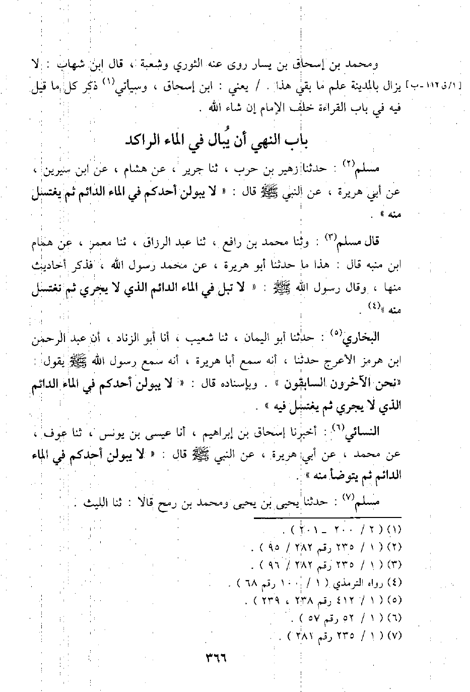 مُسلم: حَدثنَا زُهَيْر بن حَرْب، ثَنَا جرير، عَن هِشَام، عَن ابْن سِيرِين، عَن أبي هُرَيْرَة، عَن النَّبِي - صَلَّى اللَّهُ عَلَيْهِ وَسَلَّم َ - قَالَ: " لَا يبولن أحدكُم فِي المَاء الدَّائِم ثمَّ يغْتَسل مِنْهُ ".